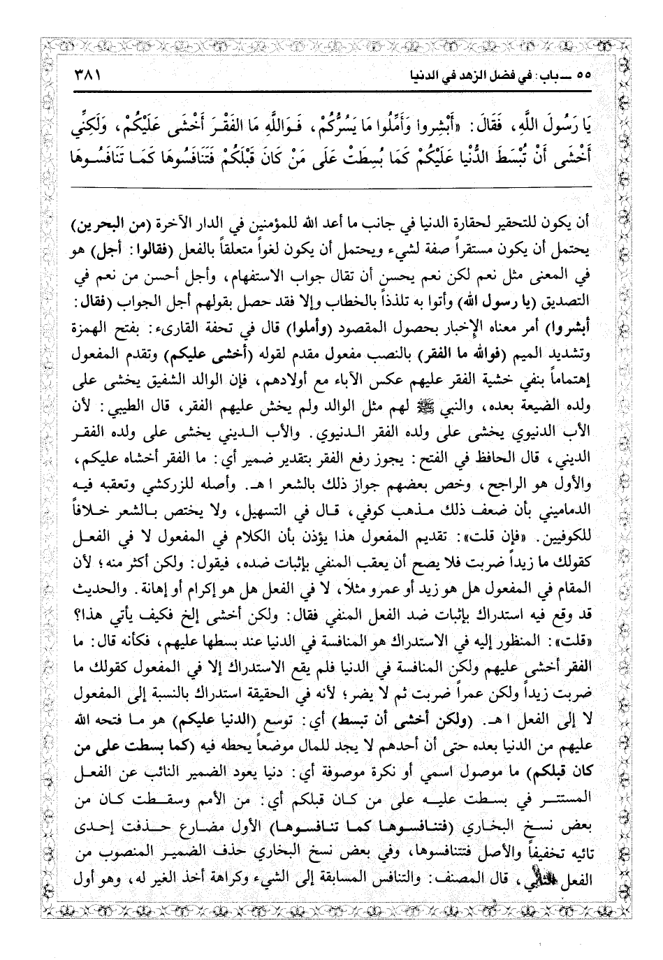 الهمزة وتشديد الميم (فوا ما الفقر) بالنصب مفعول مقدم لقوله (أخشى عليكم) وتقدم المفعول اهتماماً بنفي خشية الفقر عليهم عكس الآباء مع أولادهم، فإن الوالد الشفيق يخشى على ولده الضيعة بعده، والنبي لهم مثل الوالد ولم يخش عليهم الفقر، قال الطيبي: لأن الأب الدنيوي يخشى على ولده الفقر الدنيوي، والأب الديني يخشى على ولده الفقر الديني، قال الحافظ في «الفتح» : يجوز رفع الفقر بتقدير ضمير: أي ما الفقر أخشاه عليكم، والأول هو الراجح، وخص بعضهم جواز ذلك بالشعر اهـ. وأصله للزركشي وتعقبه فيه الدماميني بأن ضعف ذلك مذهب كوفي، قال في «التسهيل» ولا يختص بالشعر خلافاً للكوفيين. فإن قلت: تقديم المفعول هذا يؤذن بأن الكلام في المفعول لا في الفعل كقولك ما زيد ضربت فلا يصح أن يعقب المنفى بإثبات ضده، فيقول ولكن أكثر منه لأن المقام في المفعول هل هو زيد أو عمرو مثلاً، لا في الفعل هل هو إكرام أو إهانة: والحديث قد وقع فيه استدراك بإثبات ضد الفعل المنفي فقال: ولكن أخشى الخ فكيف يأتي هذا. قلت: المنظور إليه في الاستدراك هو المنافسة في الدنيا عند بسطها عليه، فكأنه قال ما الفقر أخشى عليهم ولكن المنافسة في الدنيا فلم يقع الاستدراك إلا في المفعول كقولك ما ضربت زيداً، ولكن عمراً ضربت، ثم لا يضر لأنه في الحقيقة استدراك بالنسبة إلى المفعول لا إلى الفعل اهـ. (ولكن أخشى أن تبسط) أي توسع (الدنيا عليكم) وما فتحه الله عليهم من الدنيا بعده حتى إن أحدهم لا يجد للمال موضعاً يحطه فيه (كما بسطت) ما موصول اسمي أو نكرة موصوفة: أي دنيا يعود الضمير النائب عن الفعل المستتر في بسطت عليه (على من كان قبلكم) : أي من الأمم وسقطت كان من بعض نسخ البخاري (فتنافسوها كما تنافسوها) الأول مضارع حذفت إحدى تاءيه تخفيفاً، والأصل فتتنافسوها، وفي بعض نسخ البخاري حذف الضمير المنصوب من الفعل الثاني، قال المصنف: والتنافس المسابقة إلى الشيء وكراهة أخذ......