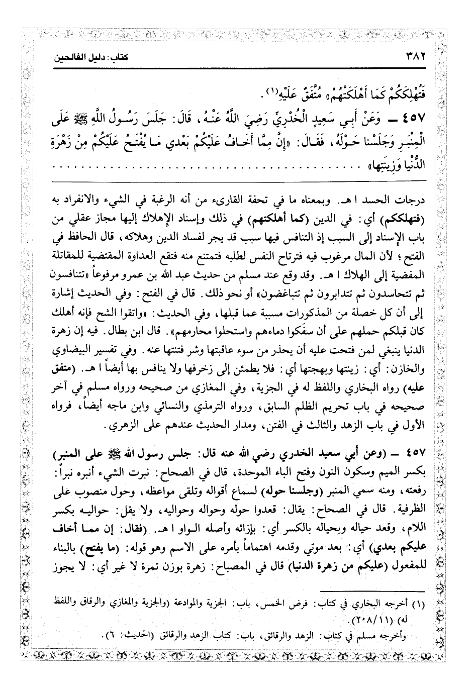 درجات الحسد اهـ. وبمعناه ما في «تحفة القاري» من أنه الرغبة في الشيء والانفراد به (فتهلككم) أي في الدين (كما أهلكتهم) في ذلك وإسناد الإهلاك إليها مجاز عقلي من باب الإسناد إلى السبب إذ التنافس فيها سبب قد يجر لفساد الدين وهلاكه، قال الحافظ في «الفتح» : لأن المال مرغوب فيه فترتاح النفس لطلبه فتمتنع منه فتقع العداوة المقتضية للمقاتلة المفضية إلى الهلاك اهـ. وقد وقع عند مسلم من حديث عبد الله بن عمرو مرفوعاً «تتنافسون ثم تتحاسدون ثم تتدابرون ثم تتباغضون» ونحو ذلك. قال في «الفتح» : وفي الحديث إشارة إلى أن كل خصلة من المذكورات مسببة عما قبلها، وفي الحديث «واتقوا الشح فإنه أهلك من قبلكم حملهم على أن سفكوا دماءهم واستحلوا محارمهم» . قال ابن بطال: فيه أن زهرة الدنيا ينبغي لمن فتحت عليه أن يحذر من سوء عاقبتها وشرّ فتنتها عنه. وفي «تفسير البيضاوي والخازن» : أي زينتها وبهجتها: أي فلا يطمئن إلى زخرفها ولا ينافس بها أيضاً اهـ. (متفق عليه) رواه البخاري واللفظ له في الجزية، وفي المغازي من «صحيحه» ، ورواه مسلم في آخر «صحيحه» في باب تحريم الظلم السابق، ورواه الترمذي والنسائي وابن ماجه أيضاً، فرواه الأوّل في باب الزهد والثالث في الفتن، ومدار الحديث عندهم على الزهري.......