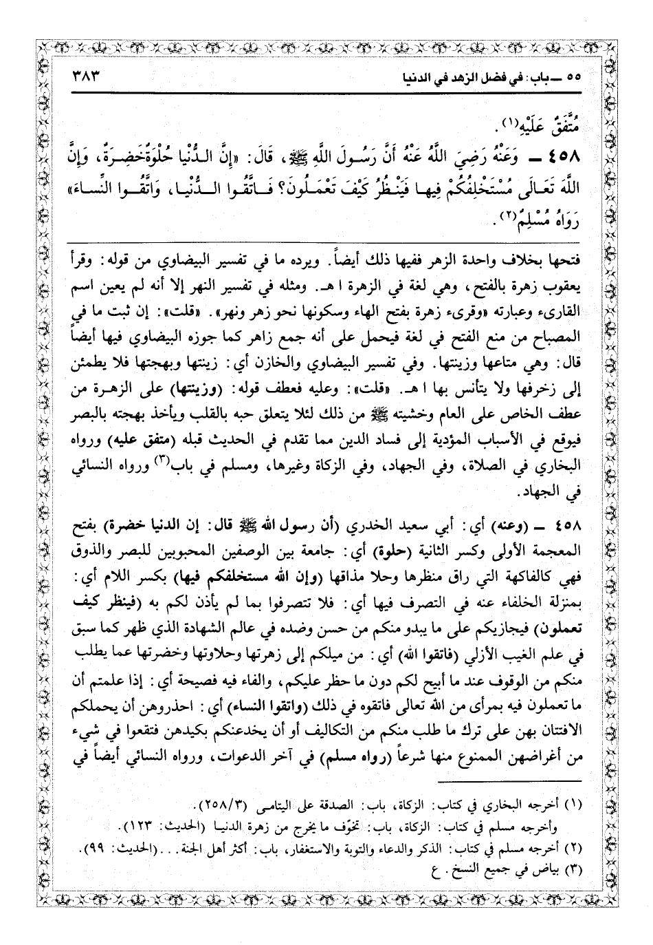 فتحها بخلاف واحدة الزهر ففيها ذلك أيضاً، ويرده ما في «تفسير البيضاوي» من قوله، وقرأ يعقوب زهرة بالفتح، وهي لغة في الزهرة اهـ. ومثله في «تفسير النهر» إلا أنه لم يعين اسم القارىء وعبارته «وقرىء زهرة بفتح الهاء وسكونها نحو زهر ونهر» . قلت: إن ثبت ما في «المصباح» من منع الفتح في لغة فيحمل على أنه جمع زاهر كما جوزه البيضاوي فيها أيضاً قال: وهي متاعها وزينتها. وفي «تفسير البيضاوي والخازن» : أي زينتها وبهجتها فلا يطمئن إلى زخرفها ولا يتأنس بها اهـ. قلت: وعليه فعطف قوله (وزينتها) على الزهرة من عطف الخاص على العام وخشيته من ذلك لئلا يتعلق حبه بالقلب ويأخذ بهجته بالبصر فيوقع في الأسباب المؤدية إلى فساد الدين مما تقدم في الحديث قبله (متفق عليه) ورواه البخاري في الصلاة وفي الجهاد وفي الزكاة وغيرها، ومسلم في باب ورواه النسائي في الجهاد.......