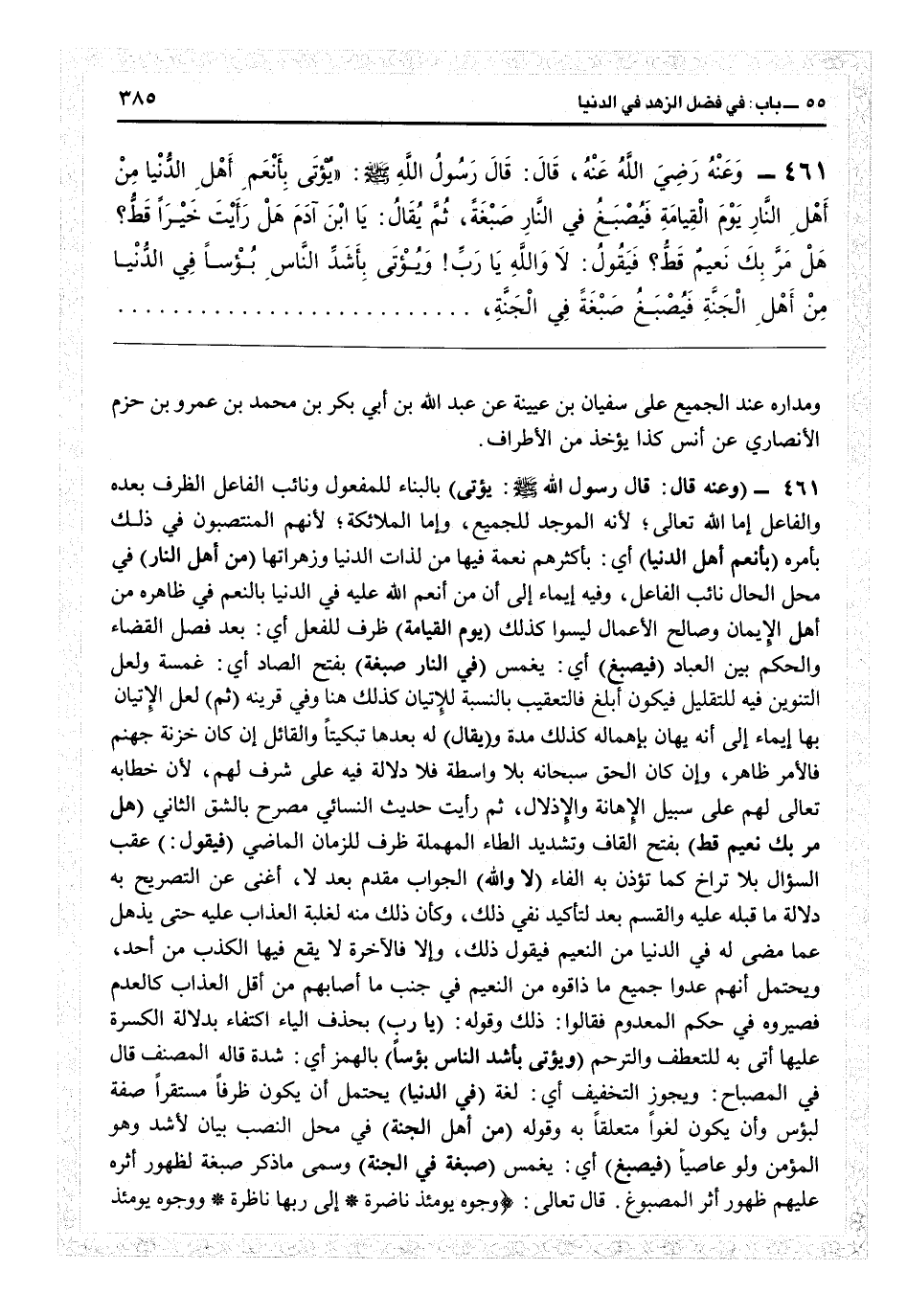 6461 - (وعنه قال: قال رسول الله: يؤتى) بالبناء للمفعول ونائب الفاعل الظرف بعده والفاعل إما الله تعالى لأنه الموجد للجميع، وإما الملائكة لأنهم المنتصبون في ذلك بأمره (بأنعم أهل الدنيا) أي بأكثرهم نعمة فيها من لذات الدنيا وزهراتها (من أهل النار) في محل الحال نائب الفاعل، وفيه إيماء إلى أن من أنعم الله عليه في الدنيا بالنعم في ظاهره من أهل الإيمان وصالح الأعمال ليسوا كذلك (يوم القيامة) ظرف للفعل: أي بعد فصل القضاء والحكم بين العباد (فيصبغ) أي يغمس (في النار صبغة) بفتح الصاد أي غمسة ولعل التنوين فيه للتقليل فيكون أبلغ فالتعقيب بالنسبة للإتيان كذلك هنا وفي قرينة (ثم) لعل الإتيان بها إيماء إلى أنه يهان بإهماله كذلك مدة (ويقال) له بعدها تبكيتاً والقائل إن كان خزنة جهنم فالأمر ظاهر، وإن كان الحق سبحانه بلا واسطة فلا دلالة فيه على شرف لهم لأن خطابه تعالى لهم على سبيل الإهانة والإذلال، ثم رأيت حديث النسائي مصرحاً بالشق الثاني (هل مر بك نعيم قط) بفتح القاف وتشديد الطاء المهملة ظرف للزمان الماضي (فيقول) عقب السؤال بلا تراخ كما تؤذن به الفاء (لا وا) الجواب مقدر بعد لا، أغنى عن التصريح به دلالة ما قبله عليه، والقسم بعد لتأكيد نفي ذلك، وكأن ذلك منه لغلبة العذاب عليه حتى يذهل عما مضى له في الدنيا من النعيم فيقول ذلك، وإلا فالآخرة لا يقع فيها الكذب من أحد، ويحتمل أنهم عدوا جميع ما ذاقوه من النعيم في جنب ما أصابهم من أقل العذاب كالعدم فصيروره في حكم المعدوم فقالوا ذلك. وقوله (يا رب) بحذف الياء اكتفاء بدلالة الكسرة عليها، أتى به للتعطف والترحم (ويؤتى بأشد الناس بؤساً) بالهمز: أي شدة، قاله المصنف، قال في «المصباح» : ويجوز التخفيف. أي لغة (في الدنيا) يحتمل أن يكون ظرفاً مستقراً صفة لبؤس وأن يكون لغواً متعلقاً به، وقوله (من أهل الجنة) في محل النصب بيان لأشد، وهو المؤمن ولو عاصياً (فيصبغ) أي......
