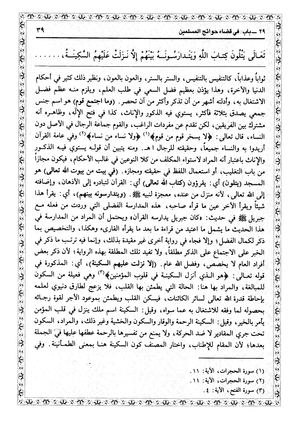 {لا يسخر قوم من قوم ولا نساء من نساء} (الحجرات: 11) وفي عامة القرآن أريدوا به والنساء جميعاً وحقيقته للرجال اهـ. ومنه يتبين أن قوله يستوي فيه الذكور والإناث باعتبار أنه المراد لاستواء المكلف من كلا النوعين في غالب الأحكام، فيكون مجازاً من باب التغليب أو استعمال اللفظ في حقيقته ومجازه (في بيت من بيوت الله تعالى) هوالمسجد (يتلون) أي يقرؤون (كتاب الله تعالى) أي القرآن لتبادره إلى الأذهان وإضافته إلى الله تعالى لأنه منزل من عنده معجزة لنبيه (ويتدارسونه بينهم) أي يقرأ هذا شيئاً ويقرأ الآخر عين ما قرأه صاحبه هذه المدارسة الفضلى التي وردت من فعله مع جبريل في حديث «كان جبريل يدارسه القرآن» ويحتمل أن المراد من المدارسة في هذا الحديث ما يشمل ما اعتيد من قراءة ما بعد ما يقرؤه القارىء وهكذا. والتخصيص بما ذكر لكمال الفضل وإلا فجاء في رواية أخرى غير مقيدة بذلك وإنما فيه ترتب ما ذكر في الخير على الاجتماع على الذكر مطلقاً ولا تقيد تلك المطلقة بهذه الرواية، لأن ذكر بعض أفراد العام لا يخصص وفضل الله عام (إلا نزلت عليم السكينة) أي المذكورة في قوله تعالى: {هو الذي أنزل السكينة في قلوب المؤمنين} (الفتح: 4) وهي فعيلة من السكون للمبالغة والمراد بها هنا الحالة التي يطمئن بها القلب، فلا يزعج لطارق دنيوي لعلمه بإحاطة قدرة الله لسائر الكائنات فيسكن القلب ويطمئن بموعود الأجر لقوّة رجائه بحصوله لما وفقه للاشتغال به عما سواه. وقيل السكينة: اسم ملك ينزل في قلب المؤمن يأمر بالخير. وقيل السكينة: الرحمة والوقار والسكون والخشية وغير ذلك، والمراد السكون تحت جري المقادير لا ضد الحركة ولا يمنع من تفسيرها بالرحمة عطفها عليها في الجملة بعدها لأن المقام للإطناب واختار المصنف كون السكينة هنا بمعنى الطمأنينة وفي
