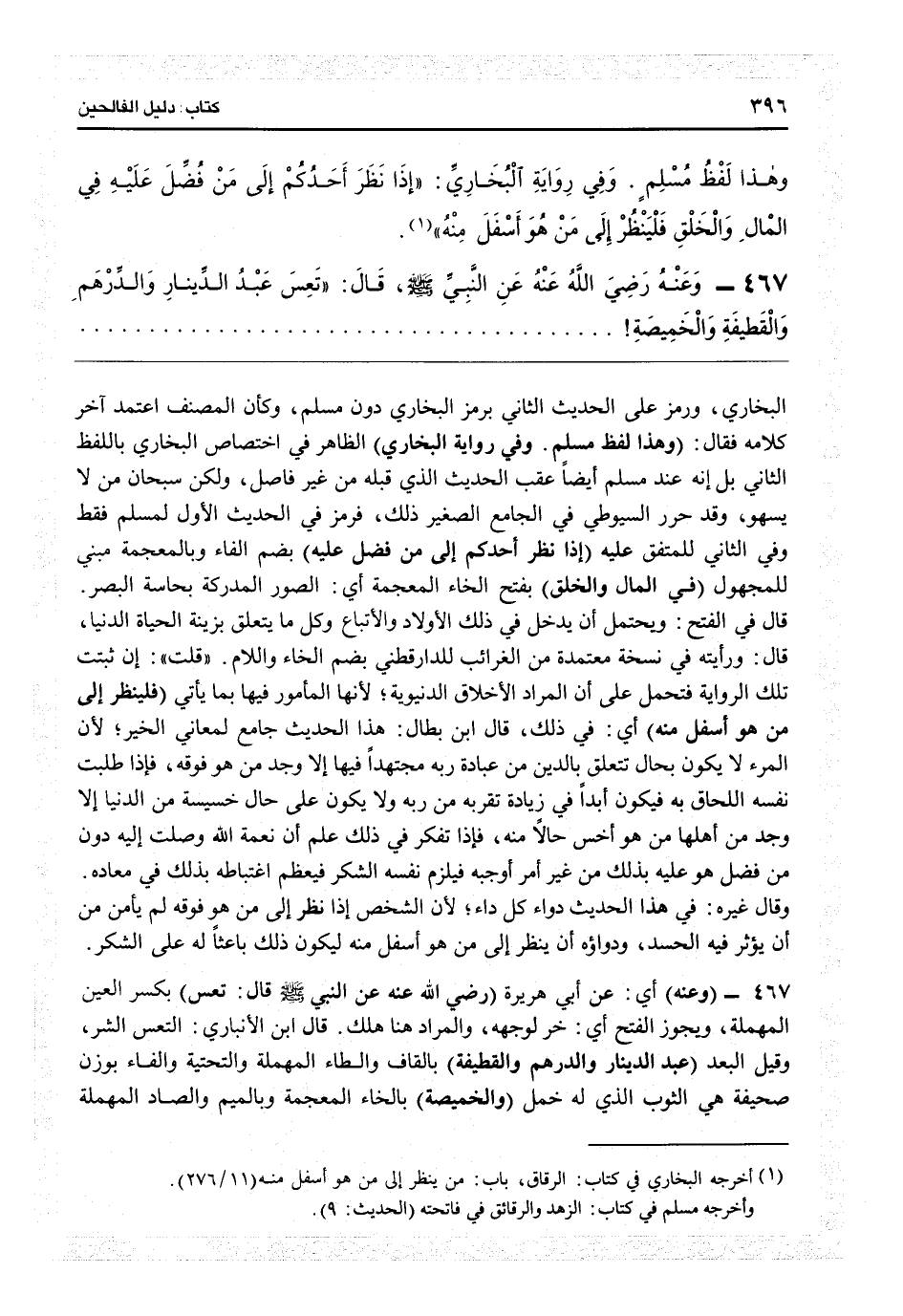 وفي رواية البخاري) الظاهر في اختصاص البخاري باللفظ الثاني بل إنه عند مسلم أيضاً عقب الحديث الذي قبله من غير فاصل، ولكن سبحان من لا يسهو، وقد حرّر السيوطي في «الجامع الصغير» ذلك فرمز في الحديث الأول لمسلم فقط وفي الثاني للمتفق عليه (إذا نظر أحدكم إلى من فضل عليه) بضم الفاء وبالمعجمة مبني للمجهول (في المال والخلق) بفتح الخاء المعجمة: أي الصورة المدركة بحاسة البصر.g قال في «الفتح» : ويحتمل أن يدخل في ذلك الأولاد والأتباع وكل ما يتعلق بزينة الحياة الدنيا، قال: ورأيته في نسخة معتمدة من «الغرائب» للدارقطني بضم الخاء واللام. قلت: إن ثبتت تلك الرواية فتحمل على أن المراد الأخلاق الدنيوية لأنها المأمور فيها بما يأتي (فلينظر إلى من هو أسفل منه) أي في ذلك، قال ابن بطال: هذا الحديث جامع لمعاني الخير، لأن المرء لا يكون بحال تتعلق بالدين من عبادة ربه مجتهداً فيها إلا وجد من هو فوقه، فإذا طلبت نفسه اللحاق به فيكون أبداً في زيادة تقربه من ربه ولا يكون على حال خسيسة من الدنيا إلا وجد من أهلها من هو أخس حالاً منه: فإذا تفكر في ذلك علم أن نعمة الله وصلت إليه دون من فضل هو عليه بذلك من غير أمر أوجبه فيلزم نفسه الشكر فيعظم اغتباطه بذلك في معاده، وقال غيره: في هذا الحديث دواء كل داء لأن الشخص إذا نظر إلى من هو فوقه لم يأمن من أن يؤثر فيه الحسد، ودواؤه أن ينظر إلى من هو أسفل منه ليكون ذلك باعثاً له على الشكر.......