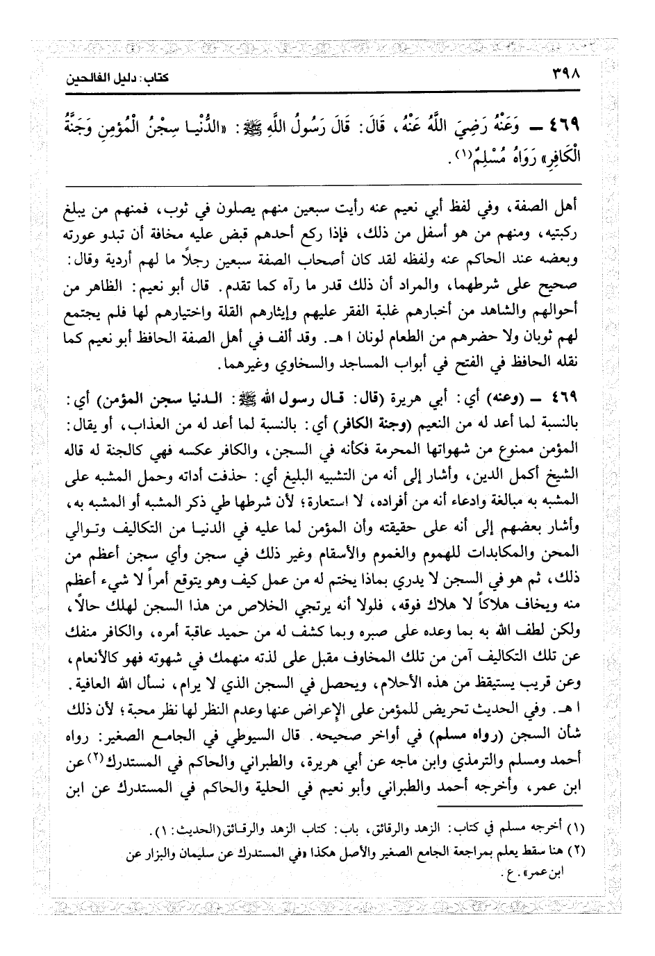 وفي الحديث تحريض للمؤمن على الإعراض عنها وعدم النظر لها نظر محبة لأن ذلك شأن السجن (رواه مسلم) في أواخر صحيحه، قال السيوطي في «الجامع الصغير» : رواه أحمد ومسلم والترمذي وابن ماجه عن أبي هريرة، والطبراني والحاكم في «المستدرك» عن ابن