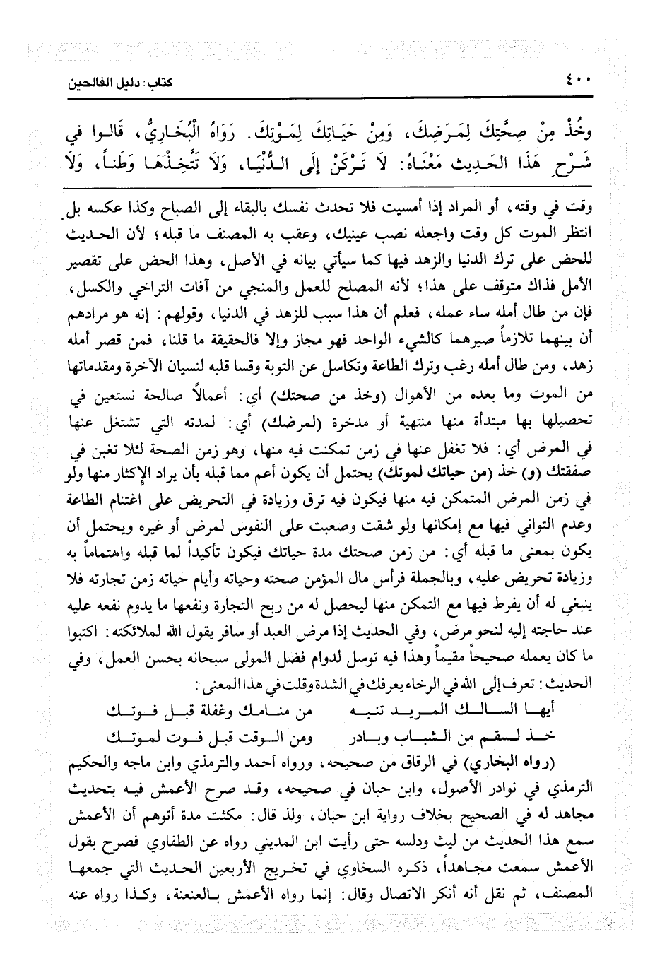 وقت في وقته، أو المراد إذا أمسيت فلا تحدث نفسك بالبقاء إلى الصباح وكذا عكسه بل انتظر الموت كل وقت واجعله نصب عينيك، وعقب به المصنف ما قبله لأن الحديث للحض على ترك الدنيا والزهد فيها كما سيأتي بيانه في الأصل، وهذا للحض على تقصير الأمل فذاك متوقف على هذا لأنه المصلح للعمل والمنجي من آفات التراخي والكسل، فإن من أطال أمله ساء عمله، فعلم أن هذا سبب للزهد في......
