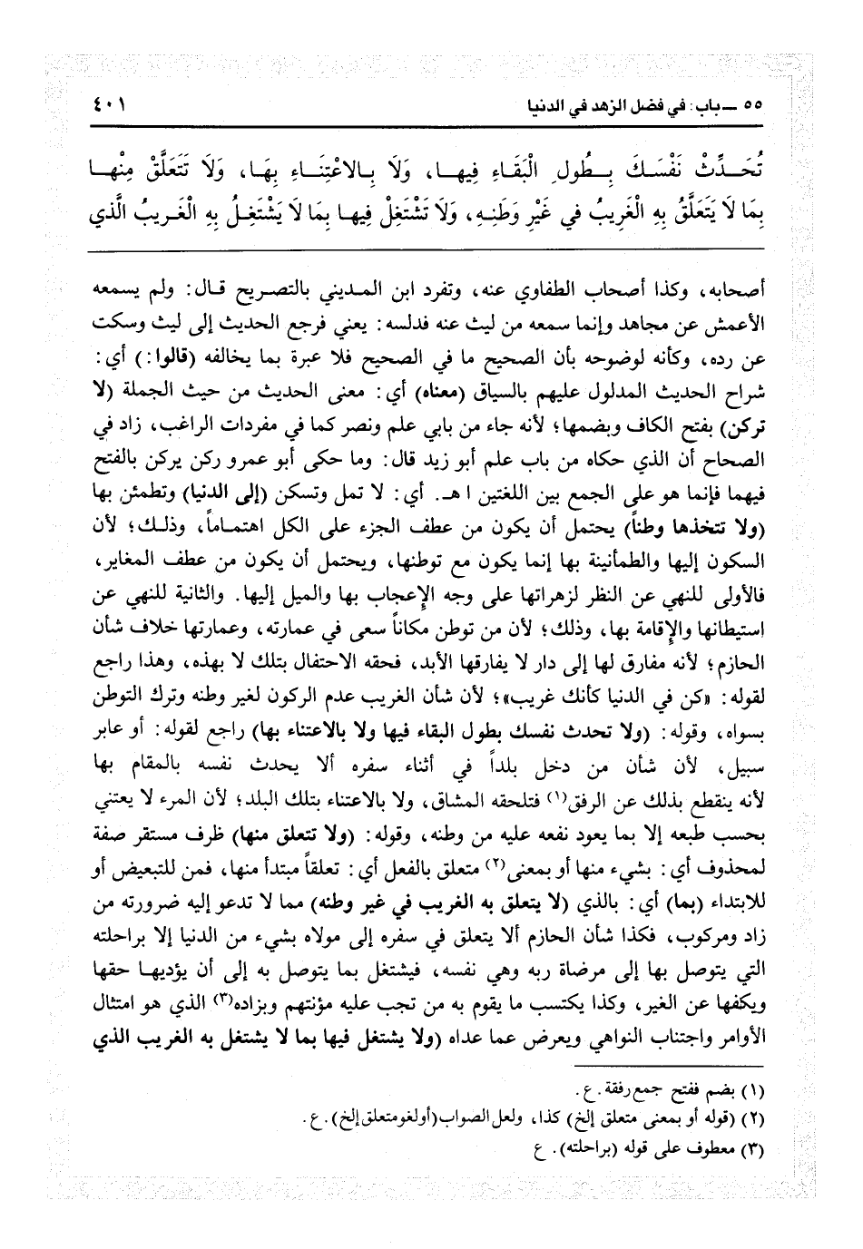 أصحابه، وكذا أصحاب الطفاوي عنه، وتفرد ابن المديني بالتصريح قال: ولم يسمعه الأعمش عن مجاهد وإنما سمعه من ليث عنه فدلسه: يعني فرجع الحديث إلى ليث وسكت عن رده، وكأنه لوضوحه بأن الصحيح ما في الصحيح فلا عبرة بما يخالفه (قالوا) أي شراح الحديث المدلول عليهم بالسياق (معناه) أي معنى الحديث من حيث الجملة (لا تركن) بفتح الكاف وبضمها لأنه جاء من بابي علم ونصر كما في «مفردات الراغب» ، زاد في «الصحاح» أن الذي حكاه من باب علم. أبو زيد قال: وما حكى أبو عمرو: ركن يركن، بالفتح فيهما فإنما هو على الجمع بين اللغتين اهـ: أي لا تمل وتسكن (إلى الدنيا) وتطمئن بها (ولا تتخذها وطناً) يحتمل أن يكون من عطف الجزء على الكل اهتماماً، وذلك لأن السكون إليها والطمأنينة بها إنما يكون مع توطنها، ويحتمل أن يكون من عطف المغاير، فالأولى للنهي عن النظر لزهراتها على وجه الإعجاب بها والميل إليها. والثانية للنهي عن استيطانها والإقامة بها، وذلك لأن من توطن مكاناً سعى في عمارته، وعمارتها خلاف شأن الحازم لأنه مفارق لها إلى دار لا يفارقها الأبد، فحقه الاحتفال بتلك لا بهذه، وهذا راجع لقوله «كن في الدنيا كأنك غريب» لأن شأن الغريب عدم الركون لغير وطنه وترك التوطن بسواه. وقوله (ولا تحدث نفسك بطول البقاء فيها ولا بالاعتناء بها) راجع لقوله أو عابر سبيل، لأن شأن من دخل بلداً في أثناء......