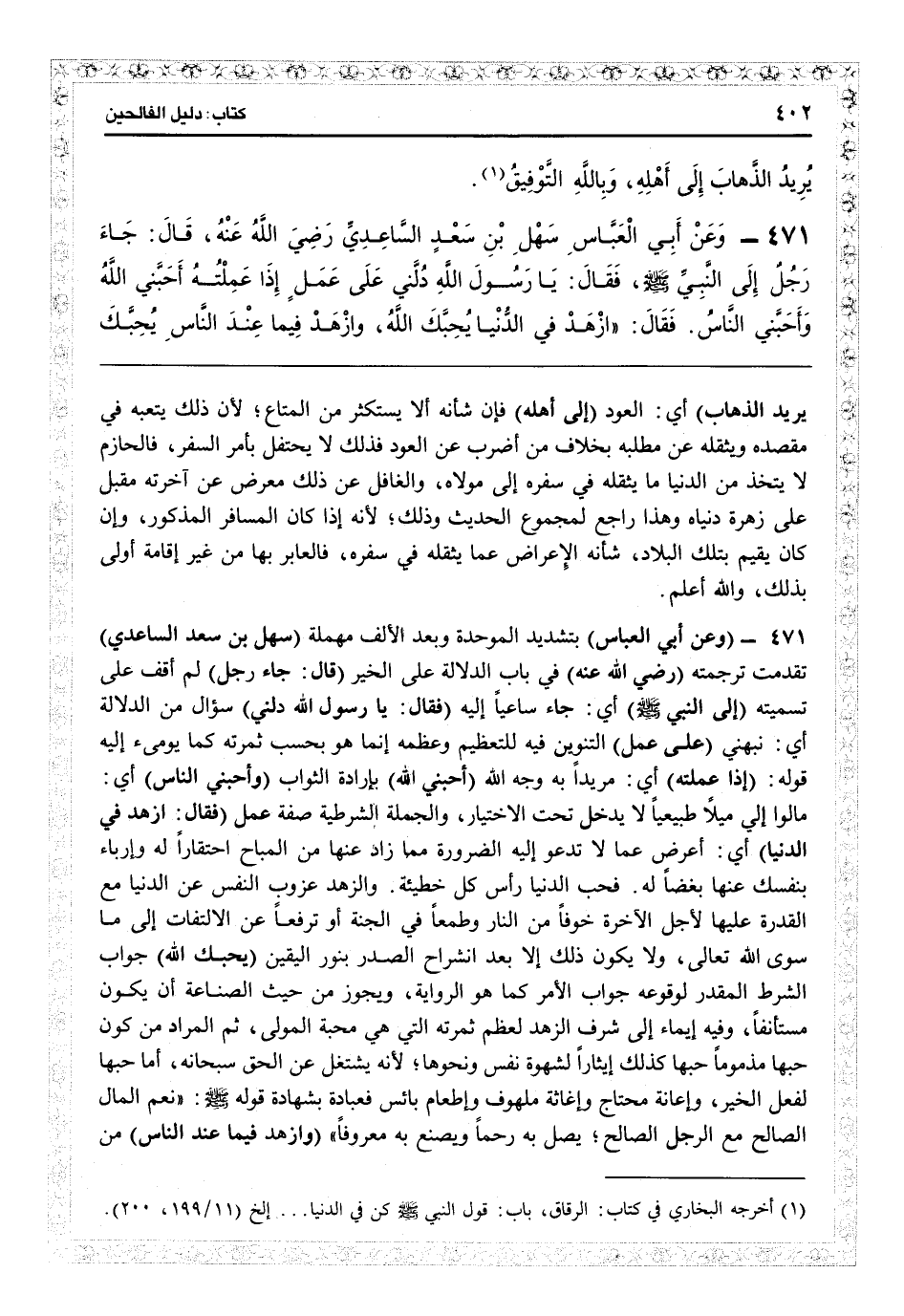 16471 - (وعن أبي العباس) بتشديد الموحدة وبعد الألف مهملة (سهل بن سعد الساعدي) تقدمت ترجمته (رضي الله عنه) في باب الدلالة على الخير (قال: جاء رجل) لم أقف على تسميته (إلى النبي) أي جاء ساعياً إليه (فقال: يا رسول الله دلني) سؤال من الدلالة أي نبهني (على عمل) التنوين فيه للتعظيم وعظمه إنما هو بحسب ثمرته كما يومىء إليه قوله (إذا عملته) أي مريداً به وجه الله (أحبني ا) بإرادة الثواب (وأحبني الناس) أي مالوا إليّ ميلاً طبيعياً لا يدخل تحت الاختيار، والجملة الشرطية صفة عمل (فقال: ازهد في الدنيا) أي أعرض عما لا تدعو إليه الضرورة مما زاد عنها من المباح احتقاراً له وإرباء بنفسك عنها بغضاً له، فحبّ الدنيا رأس كل خطيئة، والزهد عزوب النفس عن الدنيا مع القدرة عليها لأجل الآخرة خوفاً من النار وطمعاً في الجنة أو ترفعاً عن الالتفات إلى ما سوى الله تعالى، ولا يكون ذلك إلا بعد انشراح الصدر بنور اليقين (يحبك ا) جواب الشرط المقدر لوقوعه جواب الأمر كما هو الرواية، ويجوز من حيث الصناعة أن يكون مستأنفاً، وفيه إيماء إلى شرف الزهد لعظم ثمرته التي هي محبة المولى، ثم المراد من كون حبها مذموماً حبها كذلك إيثاراً لشهوة نفس ونجوها لأنه يشتغل عن الحق سبحانه، أما حبها لفعل الخير وإعانة محتاج وإغاثة ملهوف وإطعام بائس فعبادة بشهادة قوله: «نعم المال الصالح مع الرجل الصالح، يصل به رحماً ويصنع به معروفاً» (وازهد فيما عند الناس) من