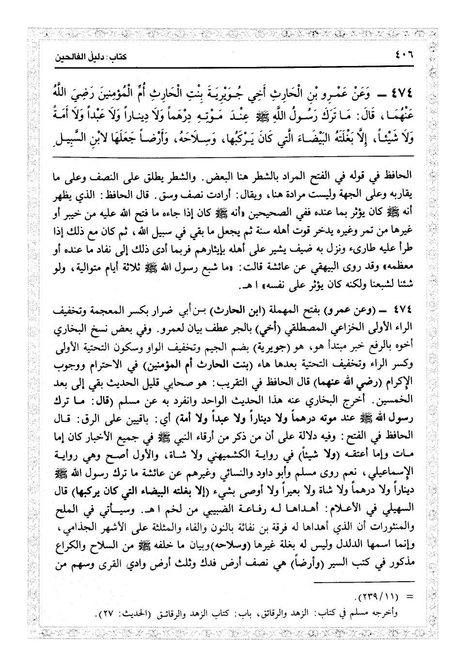 19474 - (وعن عمرو) بفتح المهملة (بن الحارث) بن أبي ضرار بكسر المعجمة وتخفيف الراء الأولى الخزاعي المصطلقى (أخي) بالجر عطف بيان لعمرو، وفي بعض نسخ البخاري أخوه بالرفع خبر مبتدأ هو، هو (جويرية) بضم الجيم وتخفيف الواو وسكون التحتية الأولى وكسر الراء وتخفيف التحتية بعدها هاء (بنت الحارث أم المؤمنين) في الاحترام ووجوب الإكرام (رضي الله عنهما) قال الحافظ في «التقريب» : هو صحابي قليل الحديث بقي إلى بعد الخمسين أخرج البخاري عنه هذا الحديث الواحد وانفرد به عن مسلم (قال: ما ترك رسول الله - صلى الله عليه وسلم - عند موته درهماً ولا ديناراً ولا عبداً ولا أمة) أي باقيين على الرق: قال الحافظ في «الفتح» : وفيه دلالة على أن من ذكر من أرقاء النبي في جميع الأخبار كان إما مات وإما أعتقه (ولا شيئاً) في رواية الكشميهني ولا شاة، والأولى أصح وهي رواية الإسماعيلي، نعم روى مسلم وأبو داود والنسائي وغيرهم عن عائشة «ما ترك رسول الله - صلى الله عليه وسلم - ديناراً ولا درهماً ولا شاة ولا بعيراً ولا أوصى بشيء» (إلا بغلته البيضاء التي كان يركبها) قال السهيلي في «الأعلام» : أهداها له رافعة الضبيبي من لخم اهـ. وسيأتي في الملح والمنثورات أن الذي أهداها له فرقة بن نفاثة بالنون والفاء والمثلثة على الأشهر الجذامي، وإنما اسمها الدلدل وليس له بغلة غيرها (وسلاحه) وبيان ما خلفه من السلاح والكراع مذكور في كتب السير (وأرضاً) هي نصف أرض فدك وثلث أرض وادي القرى وسهم من
