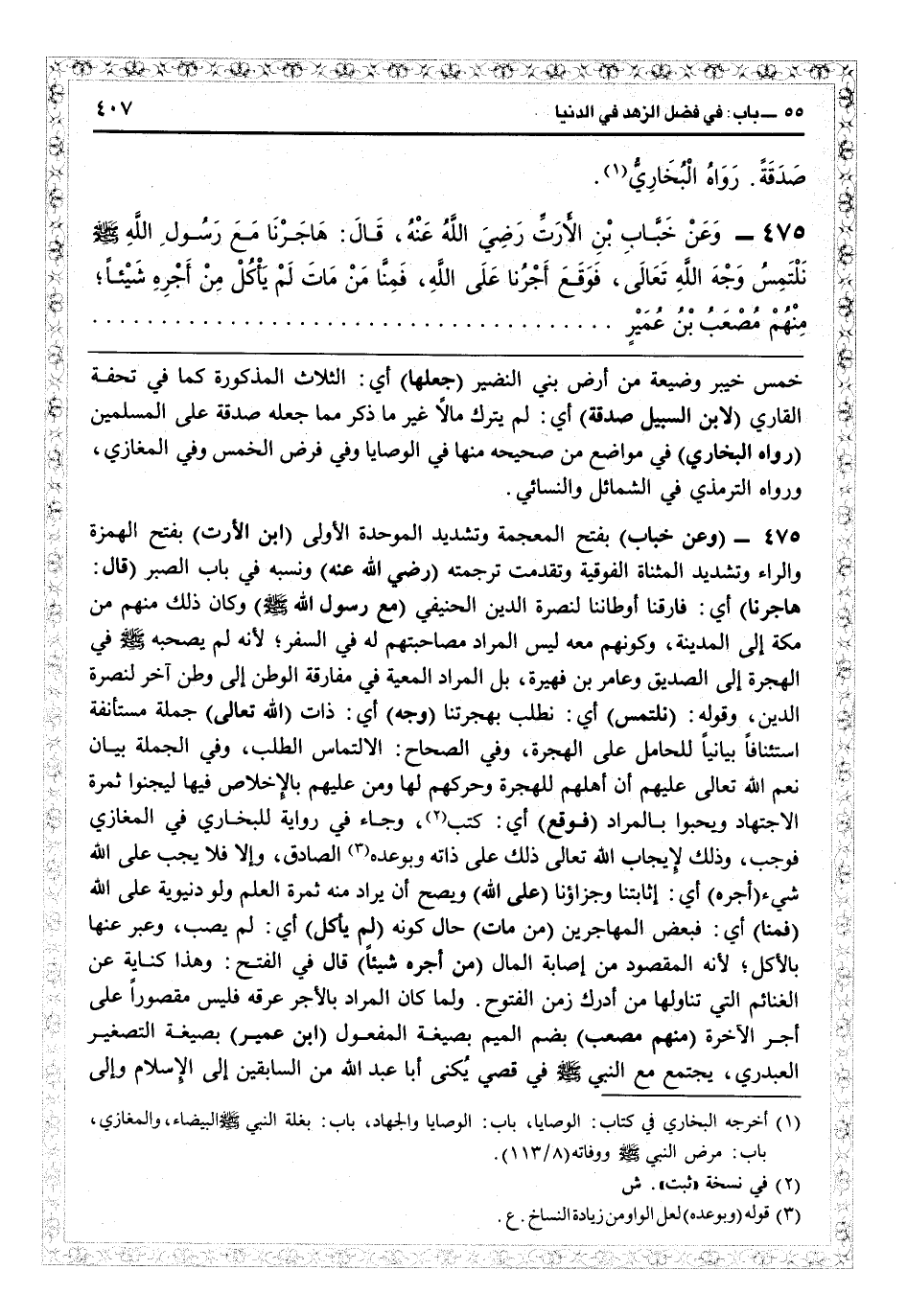 20 - (وعن خباب) بفتح المعجمة وتشديد الموحدة الأولى (ابن الأرت) بفتح الهمزة والراء وتشديد المثناة الفوقية وتقدمت ترجمته (رضي الله عنه) ونسبه في باب الصبر (قال: هاجرنا) أي فارقنا أوطاننا لنصرة الدين الحنيفي (مع رسول الله) وكان ذلك منهم من مكة إلى المدينة، وكونهم معه ليس المراد مصاحبتهم له في السفر لأنه لم يصحبه في الهجرة إلا الصديق وعامر بن فهيرة، بل المراد المعية في مفارقة الوطن إلى وطن آخر لنصرة الدين، وقوله (نلتمس) أي نطلب بهجرتنا (وجه) أي ذات (اتعالى) جملة مستأنفة استئنافاً بيانياً للحامل على الهجرة، وفي «الصحاح» : الالتماس الطلب، وفي الجملة بيان نعم الله تعالى عليهم أن أهلّهم للهجرة وحركهم لها ومنّ عليهم بالإخلاص فيها ليجنوا ثمرة الاجتهاد ويحبوا بالمراد (فوقع) أي كتب، وجاء في رواية للبخاري في المغازي فوجب، وذلك لإيجاب الله تعالى ذلك على ذاته وبوعده الصادق، وإلا فلا يجب على الله شيء (أجرنا) أي إثابتنا وجزاؤنا (على ا) ويصح أن يراد منه ثمرة العلم ولو دنيوية على الله (فينا) أي فبعض المهاجرين (من مات) حاله كونه (لم يأكل) أي لم يصب، وعبر عنها بالأكل لأنه المقصود من إصابة المال (من أجره شيئاً) قال في «الفتح» : وهذا كناية عن الغنائم التي تناولها من أدرك زمن الفتوح. ولما كان المراد بالأجر عرقه فليس مقصوراً على أجر الآخرة (منهم مصعب) بضم الميم بصيغة المفعول (ابن عمير) بصيغة التصغير، العبدري، يجتمع مع النبي في قصي يكنى أبا عبد الله من السابقين إلى الإسلام وإلى