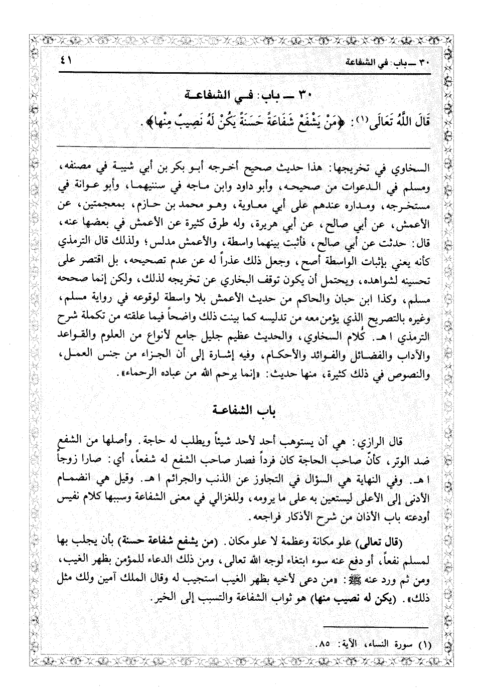(قال الله تعالى) علوّ مكانة وعظمة لا علوّ مكان ( {من يشفع شفاعة حسنة} ) بأن يجلب بها لمسلم نفعاً أو دفع عنه سوءاً ابتغاء لوجه الله تعالى، ومن ذلك الدعاء للمؤمن بظهر الغيب، ومن ثم ورد عنه: «من دعا لأخيه بظهر الغيب استجيب له. وقال الملك آمين ولك مثل ذلك» (يكن له نصيب منها) هو ثواب الشفاعة والتسبب إلى الخير.