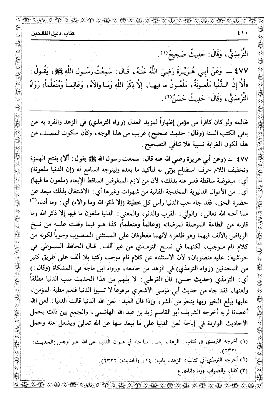 22476 - (وعن أبي هريرة رضي الله عنه قال: سمعت رسول الله - صلى الله عليه وسلم - يقول: ألا) بفتح الهمزة وتخفيف اللام حرف استفتاح يؤتى به لتأكيد ما بعده وليتوجه السامع له (إن الدنيا ملعونة) أي مبغوضة ساقطة فعبر عنه بذلك لأن من لازم المبغوض الساقط الإبعاد (ملعون ما فيها) أي من الأموال الدنيوية المخدّجة الفانية من شهوات وغيرها: أي الاشتغال بذلك مبعد عن حضرة الحق فقد جاء «حبّ الدنيا رأس كل خطيئة» (إلاّ ذكر الله وما والاه) أي وما أدناه مما أحبه الله تعالى، والولي: القرب والدنو، والمعنى: الدنيا ملعون ما فيها إلا ذكر الله وما قاربه من الطاعة الموصلة لمرضاته (وعالماً ومعلماً) كذا هو فيما وقفت عليه من نسخ الرياض بالألف فيهما وهو ظاهر، لأنهما معطوفان على المستثنى المنصوب وجوباً لكونه من كلام تام موجب، لكنهما في نسخ الترمذي من غير ألف. قال الحافظ السيوطي في حواشيه عليه: منصوبان لأن الاستثناء من كلام تام موجب وكتبا بلا ألف على طريق كثير من المحدثين (رواه الترمذي) في الزهد من «جامعه» ، ورواه ابن ماجه في المشكاة (وقال) أي الترمذي (حديث حسن) قال القرطبي: لا يفهم من هذا الحديث سب الدنيا مطلقاً ولعنها، فقد جاء من حديث أبي موسى الأشعري مرفوعاً «لا تسبوا الدنيا فنعم مطية المؤمن، عليها يبلغ الخير وبها ينجو من الشرّ، وإذا قال العبد: لعن الله الدنيا قالت الدنيا: لعن الله أعصانا لربه» أخرجه الشريف أبو القاسم زيد بن عبد الله الهاشمي، والجمع بين ذلك بحمل الأحاديث الواردة في إباحة لعن الدنيا على ما يبعد منها عن الله تعالى ويشغل عنه، وحمل