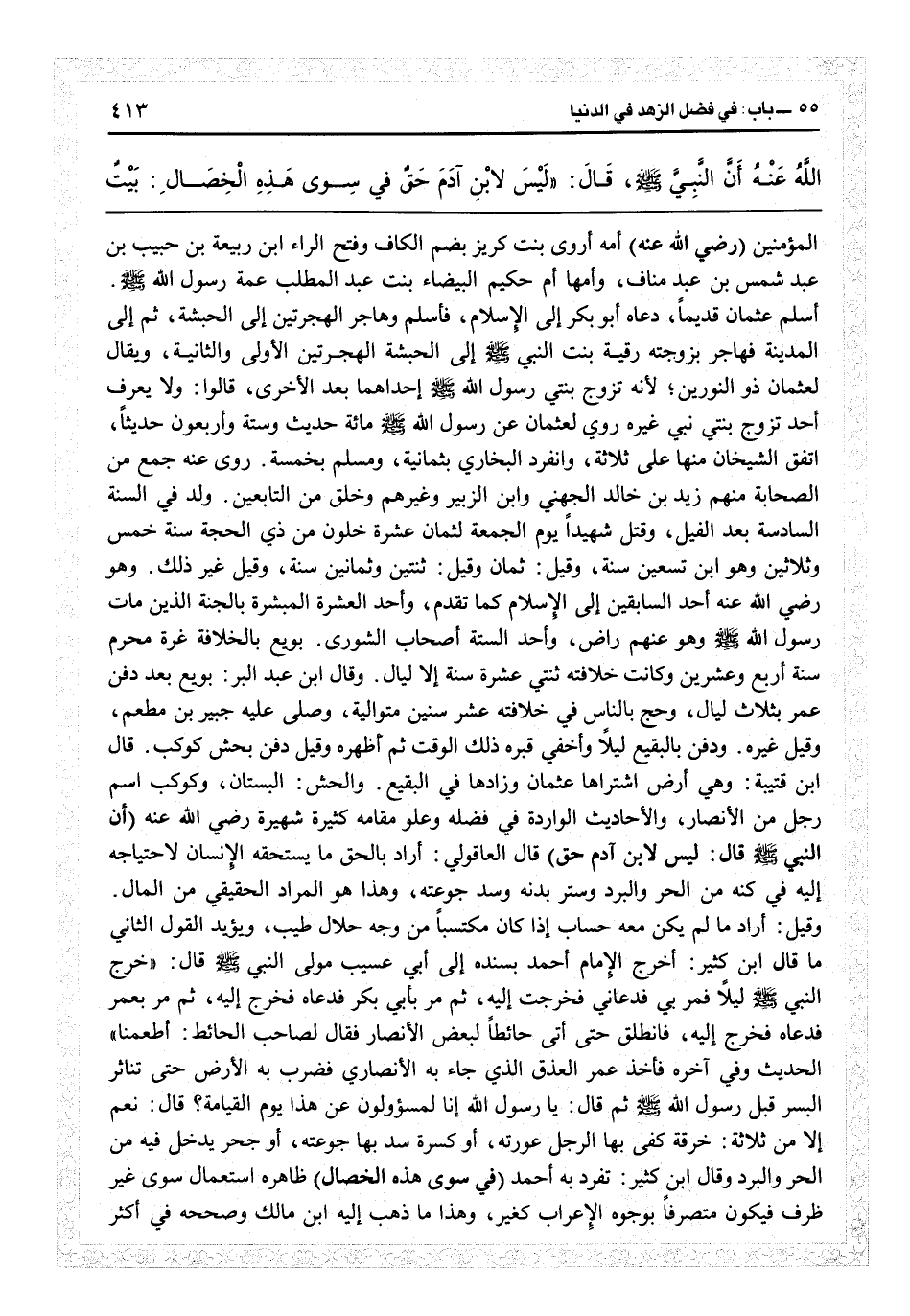 ودفن بالبقيع ليلاً وأخفي قبره ذلك الوقت ثم أظهر. وقيل دفن بحش كوكب. قال ابن قتيبة: وهي أرض اشتراها عثمان وزادها في البقيع. والحش: البستان، وكوكب اسم رجل من الأنصار، والأحاديث الواردة في فضله وعلوّ مقامه كثيرة شهيرة رضي الله عنه (أن النبيّ قال: ليس لابن آدم حق) قال العاقولي: أراد بالحق ما يستحقه الإنسان لاحتياجه إليه في كنه من الحرّ والبرد وستر بدنه وسد جوعته، وهذا هو المراد......