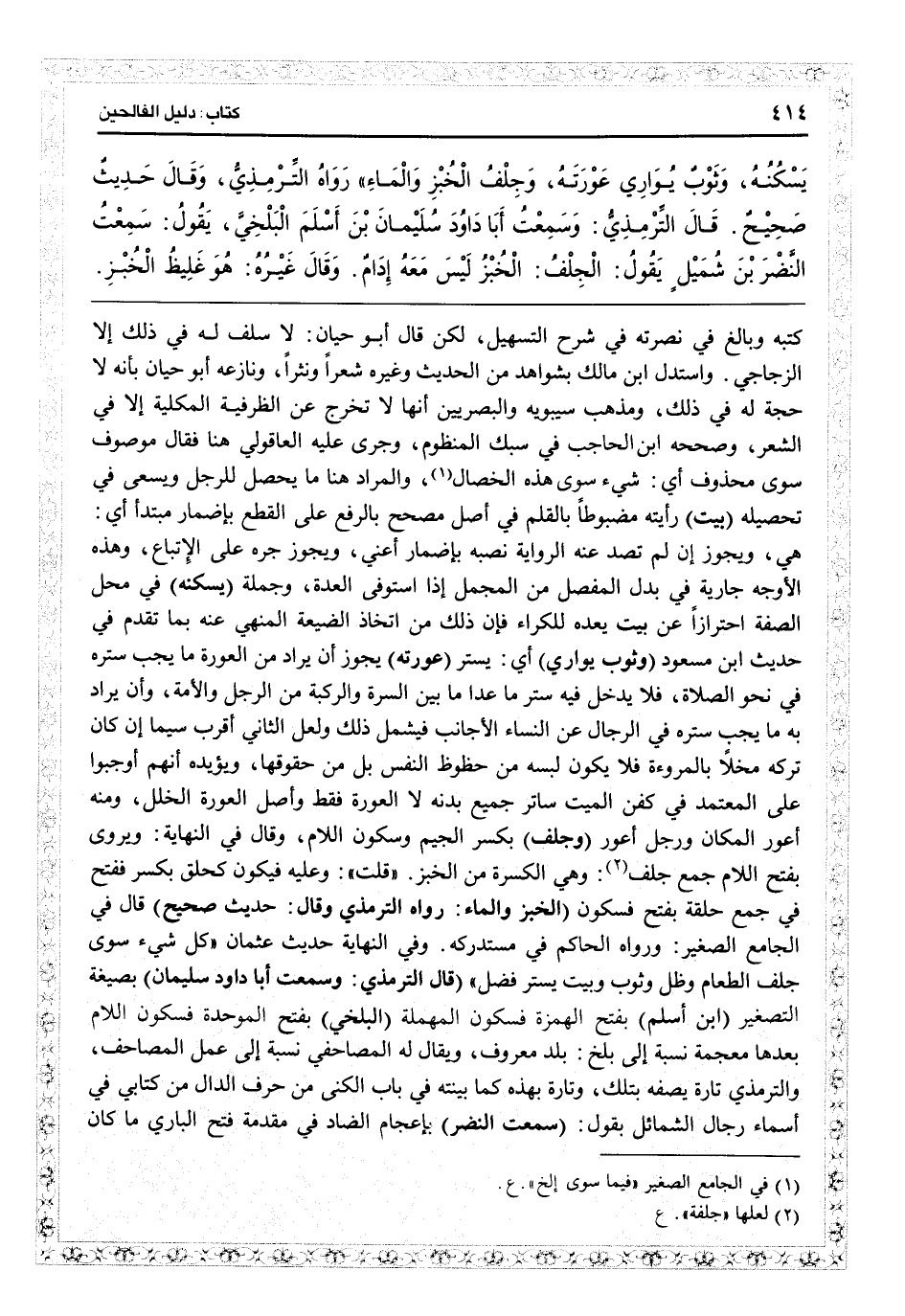 الرجل والأمة وأن يراد به ما يجب ستره في الرجال عن النساء الأجانب فيشمل ذلك ولعل الثاني أقرب سيما إن كان تركه مخلاً بالمروءة فلا يكون لبسه من حظوظ النفس بل من حقوقها، ويؤيده أنهم أوجبوا على المعتمد في كفن الميت ساتر جميع بدنه لا العورة فقط وأصل العورة الخلل، ومنه أعور المكان ورجل أعور (وجلف) بكسر الجيم وسكون اللام، وقال في «النهاية» : ويروى بفتح اللام جمع جلف: وهي الكسرة من الخبز. قلت: وعليه يكون كحلق بكسر ففتح في جمع حلقة بفتح فسكون (الخبز والماء: رواه الترمذي وقال: حديث صحيح) قال في «الجامع الصغير» : ورواه الحاكم في «مستدركه» . وفي «النهاية» حديث عثمان «إن كل شيء سوى جلف الطعام وظل وثوب وبيت يستر فضل» (قال الترمذي: وسمعت أبا داود سليمان) بصيغة التصغير (ابن أسلم) بفتح الهمزة فسكون المهملة (البلخي) بفتح الموحدة فسكون اللام بعدها معجمة نسبة إلى بلخ: بلد معروف، ويقال له المصاحفي نسبة إلى عمل المصاحف، والترمذي تارة بصفة بتلك وتارة بهذه كما بينته في باب الكنى من حرف الدال من كتابي في «أسماء رجال الشمائل» (يقول سمعت النضر) بإعجام الضاد في مقدمة «فتح الباري» ما كان