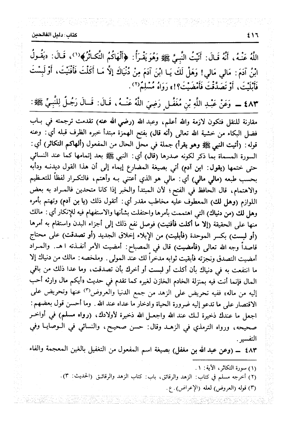 مقارنة النقل فتكون لازمة والله أعلم. وعبد الله (رضي الله عنه) تقدمت ترجمته في باب فضل البكاء من خشية الله تعالى (أنه قال) بفتح الهمز مبتدأ خبره الظرف قبله: أي وعنه قوله (أتيت النبي وهو يقرأ) جملة في محل الحال من المفعول (ألهاكم التكاثر) أي السورة المسماة بما ذكر لكونه صدرها (قال) أي النبيّ بعد إتمامها كما عند النسائي حتى ختمها (يقول ابن آدم) أتى بصيغة المضارع إيماء إلى أن هذا القول ديدنه ودأبه بحسب طبعه (مالي مالي) أي مالي هو الذي أعتني به وأهتم، فالتكرار لفظاً للتعظيم والاهتمام: قال الحافظ في «الفتح» : لأن المبتدأ والخبر إذا كانا متحدين فالمراد به بعض اللوازم (وهل لك) المعطوف عليه مخاطب مقدر: أي أتقول ذلك (يا ابن آدم) وتهتم بأمره وهل لك (من دنياك) التي اهتممت بأمرها واحتفلت بشأنها والاستفهام فيه للإنكار: أي مالك منها على الحقيقة (إلا ما أكلت فأفنيت) فوصل نفع ذلك إلى أجزاء البدن واستقام به أمرها (أو لبست) بكسر الموحدة (فأبليت) من الإبلاء: إخلاق الجديد (أو تصدقت) على محتاج قاصداً وجه الله تعالى (فأمضيت) قال في «المصباح» : أمضيت الأمر أنفذته اهـ. والمراد أمضيت التصدق ونجزته فأبقيت ثوابه مدخراً لك عند المولى. وملخصه: ما لك من دنياك إلا ما انتفعت به في دنياك بأن أكلت أو لبست أو أخرت بأن تصدقت، وما......