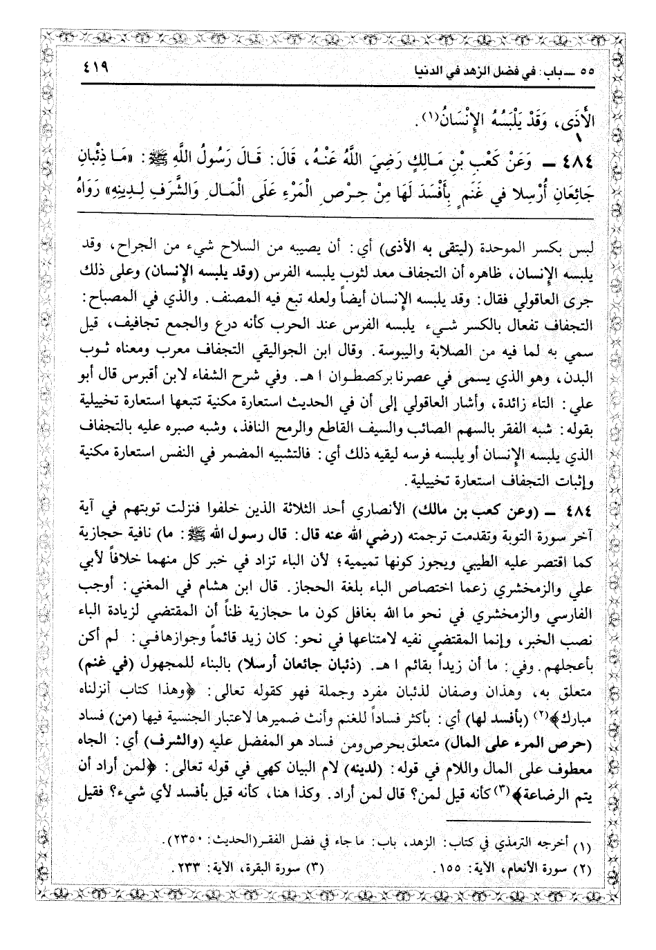 29484 - (وعن كعب بن مالك) الأنصاري أحد الثلاثة الذين خلفوا فنزلت توبتهم في آية آخر سورة التوبة وتقدمت ترجمته (رضي الله عنه قال: قال رسول الله: ما) نافيه حجازية كما اقتصر عليه الطيبي ويجوز كونها تميمية لأن الباء تزاد في خبر كل منهما خلافاً لأبي علي والزمخشري زعما اختصاص الباء بلغة الحجاز، قال ابن هشام في «المغني» : أوجب الفارسي والزمخشري في نحو {ما الله بغافل} كون ما حجازية ظناً أن المقتضى لزيادة الباء نصب الخبر، وإنما المقتضى نفيه لامتناعها في نحو كان زيد قائماً وجوازها في: لم أكن بأعجلهم. وفي ما إن زيداً بقائم اهـ. (ذئبان جائعان أرسلا) بالبناء للمجهول (في غنم) متعلق به، وهذان وصفان لذئبان مفرد وجملة فهو كقوله تعالى: {وهذا كتاب مبارك أنزلناه} (الأنعام: 155) (بأفسد لها) أي بأكثر فساداً للغنم وأنث ضميرها لاعتبار الجنسية فيها (من) فساد (حرص المرء على المال) متعلق بحرص ومن فساد هو المفضل عليه (والشرف) أي الجاه معطوف على المال واللام، في قوله (لدينه) لام البيان كهي في قوله تعالى: {لمن أراد أن يتم الرضاعة} (البقرة: 233) كأنه قيل لمن؟ قال لمن أراد. وكذا هنا كأنه قيل بأفسد لأي شيء فقيل