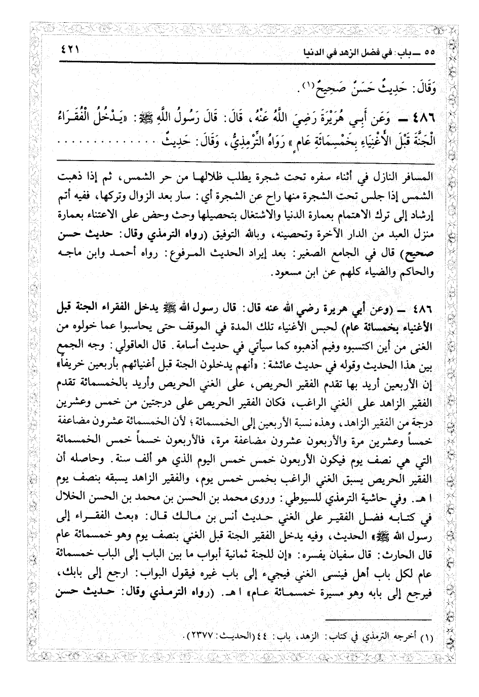 31486 - (وعن أبي هريرة رضي الله عنه قال: قال رسول الله: يدخل الفقراء الجنة قبل الأغنياء بخمسمائة عام) لحبس الأغنياء تلك المدة في الموقف حتى يحاسبوا عما خولوه من الغنى من أين اكتسبوه وفيم أذهبوه كما سيأتي في حديث أسامة. قال العاقولي: وجه الجمع بين هذا الحديث وقوله في حديث عائشة «إنهم يدخلون الجنة قبل أغنيائهم بأربعين خريفاً» أن الأربعين أريد بها تقدم الفقير الحرص على الغني الحريص، وأريد بالخمسمائة تقدم الفقير الزاهد على الغني الراغب، فكان الفقير الحريص على درجتين من خمس وعشرين درجة من الفقير الزاهد، وهذه نسبة الأربعين إلى الخمسمائة، لأن الخمسمائة عشرون مضاعفة خمساً وعشرين مرة والأربعون عشرون مضاعفة مرة، فالأربعون خمساً خمس الخمسمائة التي هي نصف يوم فيكون الأربعون خمس خمس اليوم الذي هو ألف سنة.c وحاصله أن الفقير الحريص يسبق الغني الراغب بخمس خمس يوم، والفقير الزاهد يسبقه بنصف يوم اهـ. وفي «حاشية الترمذي» للسيوطي وروى محمد بن الحسن بن محمد بن الحسن الخلال في كتابه «فضل الفقير على الغني» حديث أنس بن مالك قال «بعث الفقراء إلى رسول الله» الحديث، وفيه «يدخل الفقير الجنة قبل الغني بنصف يوم وهو خمسائة عام» قال الحارث: قال سفيان يفسره «إن للجنة ثمانية أبواب ما بين الباب إلى الباب خمسمائة عام لكل باب أهل فينسى الغنى فيجيء إلى باب غيره فيقول البواب: ارجع إلى بابك، فيرجع إلى بابه وهو مسيرة خمسمائة عام» اهـ. (رواه الترمذي وقال: حديث حسن