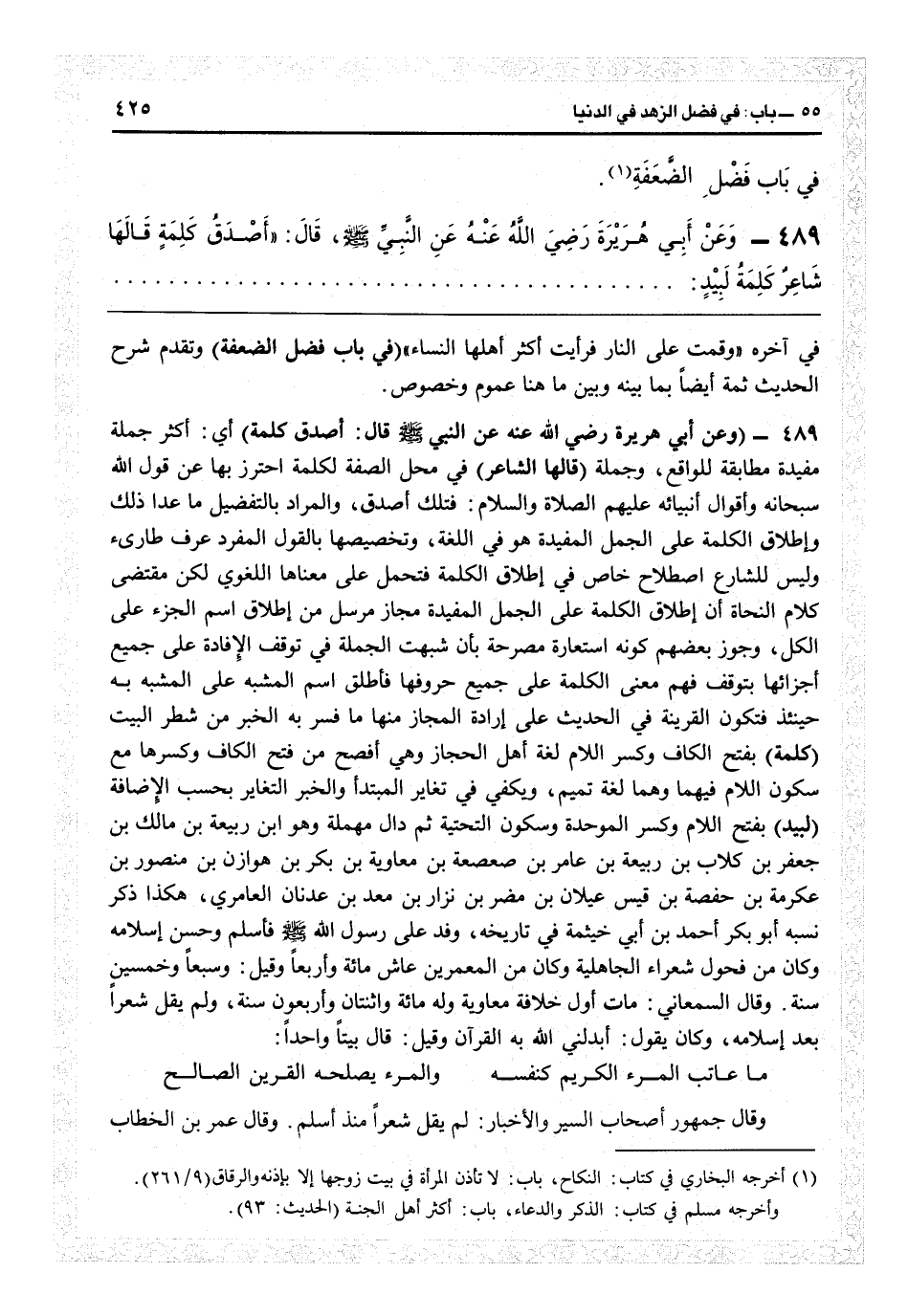 34489 - (وعن أبي هريرة رضي الله عنه عن النبي قال: أصدق كلمة) أي أكثر جملة مفيدة مطابقة للواقع وجملة (قالها شاعر) في محل الصفة لكلمة احترز بها عن قول الله سبحانه وأقوال أنبيائه عليهم الصلاة والسلام فتلك أصدق، والمراد بالتفضيل ما عدا ذلك وإطلاق الكلمة على الجمل المفيدة هو في اللغة وتخصيصها بالقول المفرد عرف طارىء وليس للشارع اصطلاح خاص في إطلاق الكلمة فتحمل على معناها اللغوي لكن مقتضى كلام النحاة أن إطلاق الكلمة على الجمل المفيدة مجاز مرسل من إطلاق اسم الجزء على الكل، وجوّز بعضهم كونه استعارة مصرحة بأن شبهت الجملة في توقف الإفادة على جميع أجزائها بتوقف فهم معنى الكلمة على جميع حروفها فأطلق اسم المشبه على المشبه به حينئذٍ فتكون القرينة في الحديث على إرادة المجاز منها ما فسر به الخبر من شرط البيت (كلمة) بفتح الكاف وكسر اللام لغة أهل الحجاز وهي أفصح من فتح الكاف وكسرها مع سكون اللام فيهما وهما لغة تيم، ويكفي في تغاير المبتدأ والخبر التغاير بحسب الإضافة (لبيد) بفتح اللام وكسر الموحدة وسكون التحتية ثم دال مهملة، وهو ابن ربيعة بن مالك بن جعفر بن كلاب ابن ربيعة بن عامر بن صعصعة بن معاوية بن بكر بن هوازن بن منصور بن عكرمة بن حفصة بن قيس عيلان بن مضر بن نزار بن معد بن عدنان العامري، هكذا ذكر نسبه أبو بكر أحمد بن أبي خيثمة في «تاريخه» ، وفد على رسول الله - صلى الله عليه وسلم - فأسلم وحسن إسلامه وكان من............