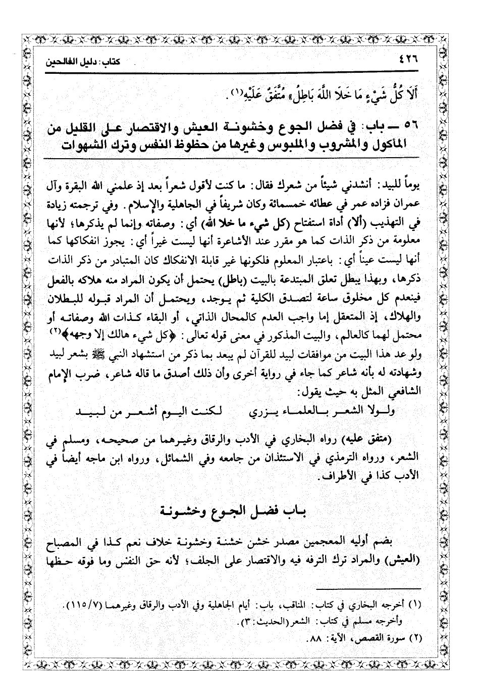 يوماً للبيد أنشدني شيئاً من شعرك فقال: ما كنت لأقول شعراً بعد إذ علمني الله البقرة وآل عمران فزاده عمر في عطائه خمسمائة. وكان شريفاً في الجاهلية والإسلام. وفي ترجمته زيادة في «التهذيب» (ألا) أداة استفتاح (كل شيء ما خلا ا) أي وصفاته وإنما لم يذكرها لأنها معلومة من ذكر الذات كما هو مقرر عند الأشاعرة أنها ليست غيراً أي يجوز انفكاكها كما أنها ليست عيناً أي باعتبار المعلوم لكونها غير قابلة الانفكاك كان المتبادر من ذكر الذات ذكرها وبهذا يبطل تعلق المبتدعة بالبيت (باطل) يحتمل أن يكون المراد منه هلاكه بالفعل فينعدم كل مخلوق ساعة لتصدق الكلية ثم يوجد، ويحتمل أن المراد قبوله للبطلان والهلاك، إذ المتعقل إما واجب العدم كالمحال الذاتي أو البقاء كذات الله وصفاته أو محتمل لهما كالعالم، والبيت المذكور في معنى قوله تعالى: {كل شيء هالك إلا وجهه} (القصص: 88) ولو عد هذا البيت من موافقات لبيد للقرآن لم يبعد بما ذكر من استشهاد النبي بشعر لبيد وشهادته له بأنه شاعر كما جاء في رواية أخرى وأن ذلك أصدق ما قاله شاعر، ضرب الإمام الشافعي المثل به حيث يقول: