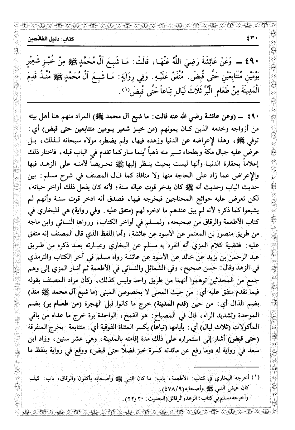 1490 - (وعن عائشة رضي الله عنها قالت: ما شبع آل محمد) المراد منهم هنا أهل بيته من أزواجه وخدمه الذين كان يمونهم (من خبز شعير يومين متتابعين حتى قبض) أي توفي، وهذا لإعراضه عن الدنيا وزهده فيها، ولم يضطره مولاه سبحانه لذلك، بل عرض عليه جبال مكة وبطحاءها تسير معه ذهباً أينما سار كما تقدم في الباب قبله، فاختار ذلك إعلاماً بحقارة الدنيا وأنها ليست بحيث ينظر إليها تحريضاً لأمته على الزهد فيها والإعراض عما زاد على الحاجة، منها ولا منافاة كا قال المصنف في «شرح مسلم» بين حديث الباب وحديث أنه كان يدخر قوت عياله سنة لأنه كان يفعل ذلك أواخر حياته، لكن تعرض عليه حوائج المحتاجين فيخرجه فيها، فصدق أنه ادخر قوت سنة وأنهم لم يشبعوا كما ذكر لأنه لم يبق عندهم ما ادخره لهم (متفق عليه) .......