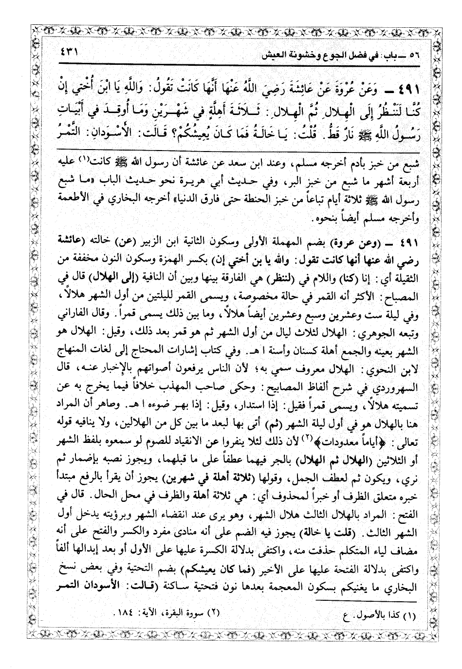 2491 - (وعن عروة) بضم المهملة الأولى وسكون الثانية ابن الزبير (عن) خالته (عائشة رضي الله عنها أنها كانت تقول وا يا ابن أختي إن) بكسر الهمزة وسكون النون مخففة من الثقيلة أي إنا (كنا) واللام في (لتنظر) هي الفارقة بينها وبين إن النافية (إلى الهلال) قال في «المصباح» : الأكثر أنه القمر في حالة مخصوصة، ويسمى القمر لليلتين من أول الشهر هلالاً، وفي ليلة ستّ وعشرين وسبع وعشرين أيضاً هلالاً، وما بين ذلك يسمى قمراً. وقال الفارابي وتبعه الجوهري: الهلال لثلاث ليال من أول الشهر ثم هو قمر بعد ذلك، وقيل الهلال هو الشهر بعينه والجمع أهلة كسنان وأسنة اهـ. وفي كتاب «إشارات المحتاج إلى لغات المنهاج» لابن النحوي: الهلال معروف سمي به لأن الناس يرفعون أصواتهم بالإخبار عنه. قال السهروردي في «شرح ألفاظ المصابيح» : وحكى صاحب «المهذب» خلافاً فيما يخرج به عن تسميته هلالاً، ويسمى قمراً فقيل إذا استدار، وقيل إذا بهر ضوؤه اهـ. وظاهر أن المراد هنا بالهلال هو في أول ليلة الشهر (ثم) أتت بها لبعد ما بين كل من الهلالين ولا ينافيه قوله تعالى: {أياماً معدودات} (البقرة: 184) لأن ذلك لئلا ينفروا عن الانقياد للصوم لو سمعوه بلفظ الشهر أو الثلاثين (الهلال ثم الهلال) بالجر فيهما عطفاً على ما قبلهما، ويجوز نصبه بإضمار: ثم نرى، ويكون ثم لعطف الجبل، وقولها (ثلاثة أهلة في شهرين) يجوز أن يقرأ بالرفع مبتدأ خبره متعلق الظرف أو خبر لمحذوف: أي هي ثلاثة أهلة والظرف في محل الحال. قال في «الفتح» : المراد بالهلال الثالث هلال الشهر، وهو ير عند انقضاء الشهر وبرؤيته يدخل أول الشهر الثالث (قلت: يا خالة) يجوز فيه الضم على أنه منادى مفرد والكسر والفتح على أن مضاف لياء المتكلم حذفت منه واكتفى بدلالة الكسرة عليها على الأول أو بعد إبدالها ألفاً واكتفى بدلالة الفتحة عليها على الأخير (فما كان يعيشكم) بضم التحتية وفي بعض نسخ البخاري ما......