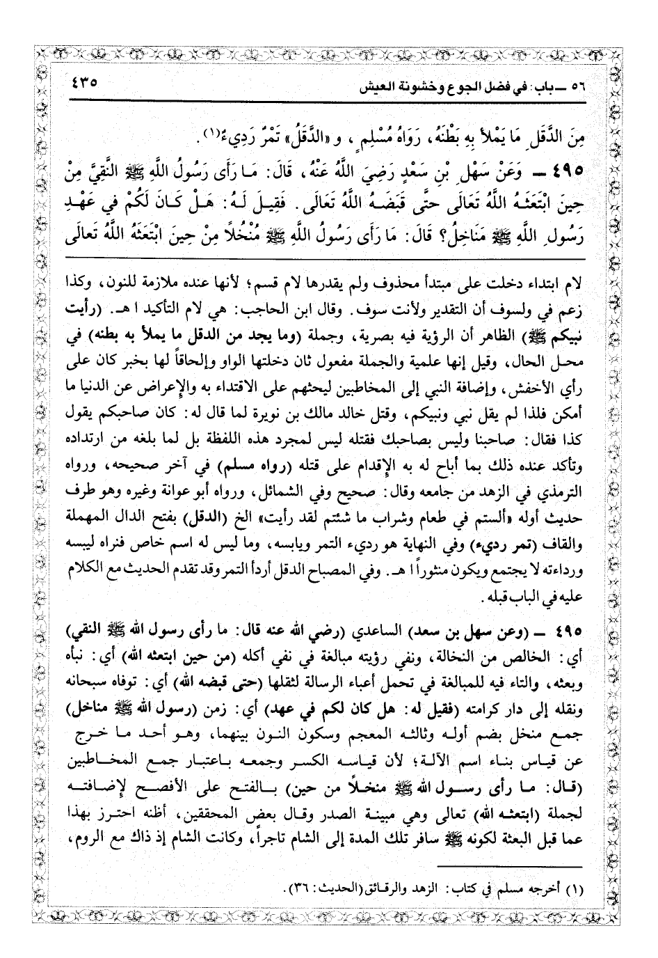 لام ابتداء دخلت على مبتدأ محذوف ولم يقدرها لام قسم لأنها عنده ملازمة للنون، وكذا زعم في ولسوف أن التقدير ولأنت سوف. وقال ابن الحاجب: هي لام التأكيد اهـ. (رأيت نبيكم) الظاهر أن الرؤية فيه بصرية وجملة (وما يجد من الدقل ما يملأ به بطنه) في محل الحال، وقيل إنها علمية والجملة مفعول ثان دخلتها الواو إلحاقاً لها بخبر كان على رأي الأخفش، وإضافة النبيّ إلى المخاطبين ليحثهم على الاقتداء به والإعراض عن الدنيا ما أمكن، فلذا لم يقل نبييّ ونبيكم، وقتل خالد مالك بن نويرة لما قال له كان صاحبكم يقول كذا فقال صاحبنا ولي بصاحبك فقتله ليس لمجرد هذه اللفظة بل لما بلغه من ارتداده وتأكد عنده ذلك بما أباح له به الإقدام على قتله (رواه مسلم) في آخر «صحيحه» ، ورواه الترمذي في الزهد من «جامعه» وقال صحيح وفي الشمائل، ورواه أبو عوانة وغيره وهو طرف حديث أوله «ألستم في طعام وشراب ما شئتم لقد رأيت» الخ (الدقل) بفتح الدال المهملة والقاف (تمر رديء) وفي «النهاية» هو رديء التمر ويابسه، وما ليس له اسم خاص فتراه ليبسه ورداءته لا يجتمع ويكون منثوراً اهـ. وفي «المصباح» الدقل أردأ التمر وقد تقدم الحديث مع الكلام عليه في الباب قبله.......