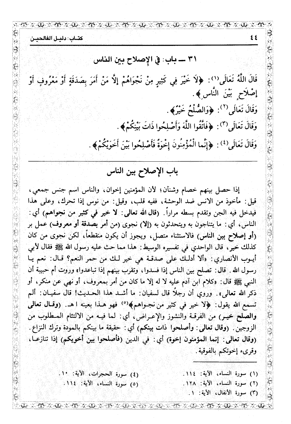 إذا حصل بينهم خصام وشنآن لأن المؤمنين إخوان. والناس اسم جنس جمعي: قيل مأخوذ من الأنس ضد الوحشة ففيه قلب وقيل من نوس إذا تحرك، وعلى هذا فيدخل فيه الجن وتقدم بسطه مراراً (قال الله تعالى: {لا خير في كثير من نجواهم} ) أي الناس أي ما يتناجون به ويتحدثون به ( {إلا} ) نجوى ( {من أمر بصدقة أو معروف} ) عمل برّ ( {أو إصلاح بين الناس} ) فالاستثناء متصل ويجوز أن يكون منقطعاً لكن نجوى من كان كذلك خير. قال الواحدي في تفسيره «الوسيط» : هذا مما حث عليه رسول الله - صلى الله عليه وسلم - فقال لأبي أيوب الأنصاري: «ألا أدلك على صدقة هي خير لك من حمر النعم؟ قال: نعم يا رسولالله، قال: تصلح بين الناس إذا فسدوا وتقرّب بينهم إذا تباعدوا» وروت أم حبيبة أن النبي قال: «كلام ابن آدم عليه الإله، إلا ما كان من أمر بمعروف أو نهي عن منكر أو ذكر تعالى» وروي أن رجلاً قال لسفيان: ما أشد هذا الحديث قال سفيان: ألم تسمع الله يقول: {لا خير في كثير من نجواهم} فهو هذا بعينه اهـ.