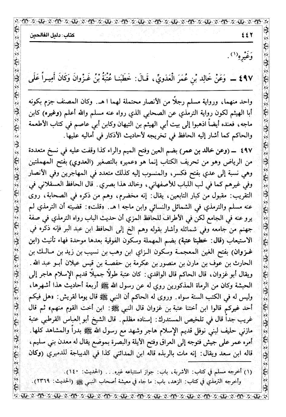 8 - (وعن خالد بن عمر) بضم العين وفتح الميم والراء كذا وقفت عليه في نسخ متعددة من الرياض وهو من تحريف الكتاب إنما هو «عمير» بالتصغير (العدوي) بفتح المهملتين وهي نسبة إلى عدي بفتح فكسر، والمنسوب إليه كذلك متعدد في المهاجرين وفي الأنصار وفي غيرهم كما في «لب اللباب» للأصفهاني، وخالد هذا بصري. قال الحافظ العسقلاني في «التقريب» : مقبول من كبار التابعين، يقال: إنه مخضرم، وهم من ذكره في الصحابة، روى عنه مسلم والترمذي في «الشمائل» وابن ماجه اهـ. قلت: قضيته أن الترمذي لم يرو عنه في «الجامع» لكن في «الأطراف» للحافظ المزي أن حديث الباب رواه الترمذي في صفة جهنم من «جامعه» وفي «شمائله» وأشار بقولهم «وهم الخ» إلى الحافظ ابن عبد البر فإنه ذكره في «الاستيعاب» (قال خطبنا عتبة) بضم المهملة وسكون الفوقية بعدها موحدة فهاء تأنيث (ابن غزوان) بفتح الغين المعجمة وسكون الزاي ابن وهب بن نسيب بن زيد بن مالك بن الحارث بن عوف بن مازن بن منصور بن عكرمة بن خصفة بن قيس عيلان أبو عبد الله. ويقال أبو غزوان، قال الحاكم قال الواقدي: كان عتبة طوالاً جميلاً قديم الإسلام هاجر إلى الحبشة وكان من الرماة المذكورين، روي له عن رسول الله - صلى الله عليه وسلم - أربعة أحاديث هذا أشهرها، وليس له في الكتب الستة سواه. وروى له الحاكم أن النبي قال يوماً لقريش: «هل فيكم أحد غيركم؟» قالوا: ابن أختنا عتبة بن غزوان قال النبي: «ابن أخت القوم منهم» ثم قال: غريب جداً. قال في «تلخيص المستدرك» : إسناده مظلم. قال الشيخ أبو العباس القرطبي: عتبة مازني حليف لبني توفل قديم الإسلام، هاجر وشهد مع رسول الله - صلى الله عليه وسلم - بدراً والمشاهد كلها. أمّره عمر على جيش فتوجه إلى العراق وفتح الأبلة والبصرة بموضع يقال له: معدن بني سليم، قاله ابن سعد. ويقال: إنه مات بالربذة، قاله ابن المدائني كذا في «الديباجة» للدميري (وكان