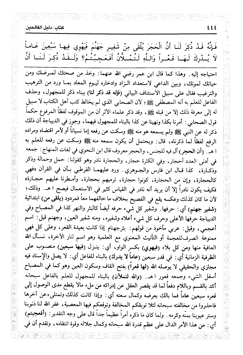 هـ. وذلك لأن ما كان كذلك وعكسه يقع في الفصيح بخلاف ما خالفهما معاً فمردود (يلقى من) ابتدائية (شفير جهنم) أي حرفها. وشفير كل شيء حرفه أيضاً كالبئر والنهر كذا في «المصباح» وفي «الديباجة» حرفها الأعلى كل شيء أعلاه وشفيره، ومنه شفير العين، وجهنم قيل: اسم أعجمي، وقيل: عربي مأخوذ من قولهم: بئر جهنام إذا كانت بعيدة القعر، وعلى كل فهي ممنوعة الصرف للعجمة أو التأنيث المعنوي مع العلمية، وهو اسم لنار الآخرة: نسأل الله العافية منها ومن كلا بلاء (فيهوي) بكسر الواو، أي ينزل (فيها سبعين) منصوب على الظرفية الزمانية: أي في قدر سبعين (عاماً لا يدرك) بالبناء للفاعل: أي لا يصل والإسناد فيه مجازي والحقيقي لا يوصله الله (لها قعراً) بفتح القاف وسكون العين وهو كما في «المصباح» أسفل الشيء وجمعه قعوراً اهـ (وا لتملأن) بالبناء للمجهول للعلم بالفاعل سبحانه أكد بالقسم وباللام دفعاً لما قد يقصر العقل عن إدراكه من ملء ما لا يقطع مدى الوصول إلى قعره سبعين عاماً فما بالك بعرضه وكمال سعته: أي وإذا كان كذلك وتمتلىء عن آخرها فاحذروا من مخالفته سبحانه لئلا توبقكم المخالفة وتوقعكم فيها المعصية، غفر الله لنا ذنوبنا وستر عيوبنا بمنه وكرمه وبما كان ما ذكره أمراً عظيماً جداً قال على وجه التقرير (أفعجبتم) أي من هذا الأمر الدال على عظم قدرة الله سبحانه وكمال جلاله وقوة انتقامه وتقدم أن في