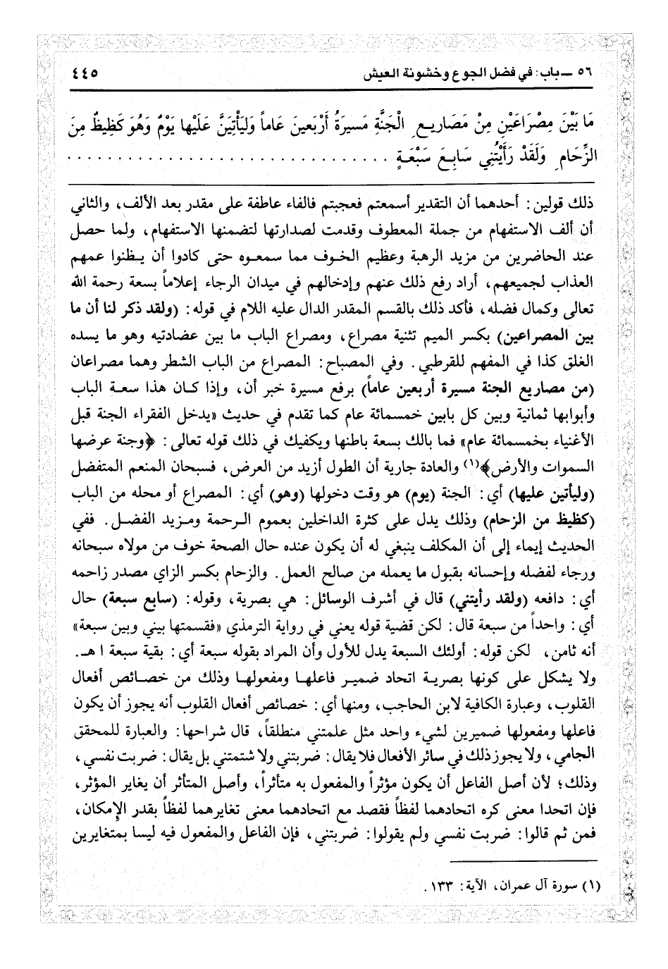 {وجنة عرضها السموات والأرض} (آل عمان: 133) والعادة جارية أن الطول أزيد من العرض، فسبحان المنعم المتفضل (وليأتين عليها) أي الجنة (يوم) هو وقت دخولها (وهو) أي المصراع أن محله من الباب (كظيظ من الزحام) وذلك ما يدل على كثرة الداخلين بعموم الرحمة ومزيد الفضل ففي الحديث إيماء إلى أن المكلف ينبغي له أن يكون عنده حال الصحة خوف من مولاه سبحانه ورجاء لفضله إحسانه بقبول ما يعمله من صالح العمل. والزحام بكسر الزاي مصدر زاحمه: أي دافعه (ولقد رأيتني) قال في «أشرف الوسائل» هي بصرية وقوله: (سابع سبعة) حال: أي واحداً من سبعة، قال: لكن قضية قوله: يعني في رواية الترمذي فقسمتها بيني وبين سبعة» أنه ثامن، لكن قوله: أولئك السبعة يدل للأول وأن المراد بقوله سبعة: أي بقية سبعة اهـ. ولا يشكل على كونها بصرية اتحاد ضمير فاعلها ومفعولها وذلك من خصائص أفعال القلوب، وعبارة «الكافية» لابن الحاجب، ومنها: أي خصائص أفعال القلوب أنه يجوز أن يكون فاعلها ضميرين لشيء واحد مثل علمتني منطلقاً، قال شراحها: والعبارة للمحقق الجامي، ولا يجوز ذلك في سائر الأفعال فلا يقال: ضربتني ولا شتمتني بل يقال: ضربت نفسي، وذلك لأن أصل الفاعل أن يكون مؤثراً والمفعول به متأثراً، وأصل المتأثر أن يغاير المؤثر، فإن اتحدا معنى كره اتحادهما لفظاً فقصد مع اتحادهما معنى تغايرهما لفظاً بقدر الإمكان، فمن ثم قالوا: ضربت نفسي ولم يقولوا: ضربتني، فإن الفاعل