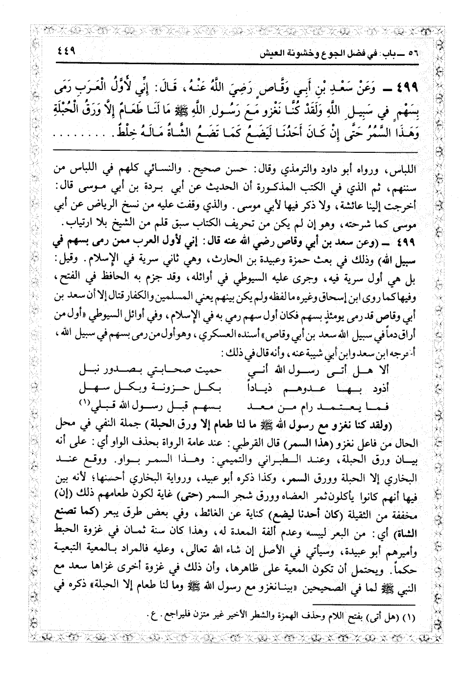 (ولقد كنا نغزو مع رسول الله - صلى الله عليه وسلم - ما لنا طعام إلا ورق الحبلة) جملة النفي في محل الحال من فاعل نغزو (وهذا السمر) قال القرطبي: عند عامة الرواة بحذف الواو: أي على أنه بيان ورق الحبلة، وعند الطبراني والتميمي: وهذا السمر بواو، ووقع عند البخاري إلا الحبلة وورق السمر، وكذا ذكره أبو عبيد، ورواية البخاري أحسنها لأنه بين فيها أنهم كانوا يأكلون ثمر العضاة وورق الشجر السمر (حتى) غاية لكون طعامهم ذلك (إن) مخففة من الثقيلة (كان أحدنا ليضع) كناية عن الغائط، وفي بعض طرقه «يبعر» (كما تضع الشاة) أي من البعر ليبسه وعدم ألفة المعدة له، وهذا كان سنة ثمان في غزوة الخبط وأميرهم أبو عبيدة، وسيأتي في الأصل إن شاء الله تعالى، وعليه، فالمراد بالمعية التبعية حكماً، ويحتمل أن تكون المعية على ظاهرها، وأن ذلك في غزوة أخرى غزاها سعد مع النبي لما في «الصحيحين» «بينا نغزو مع رسول الله - صلى الله عليه وسلم - وما لنا طعام إلا الحبلة» ذكره في