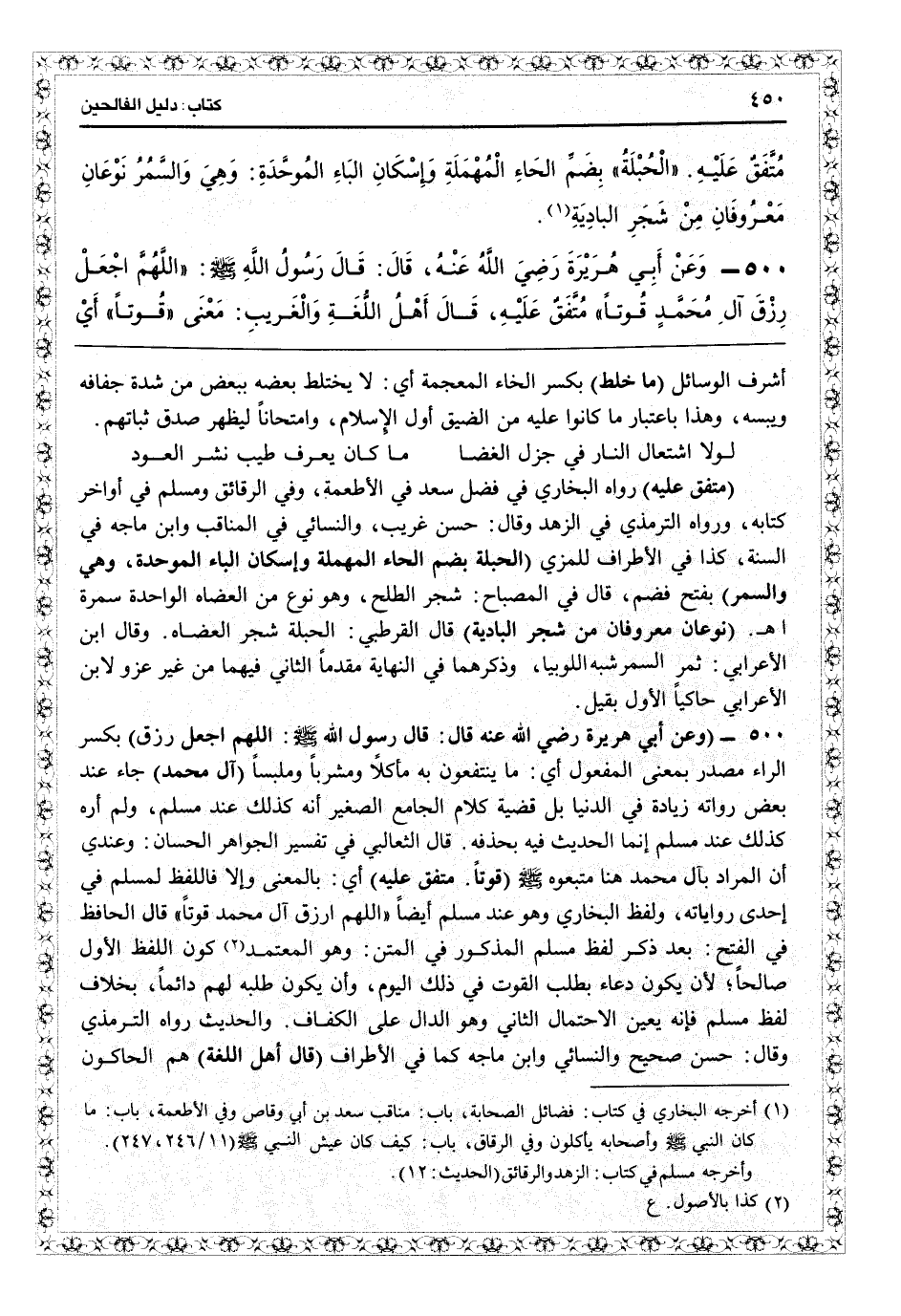 (متفق عليه) رواه البخاري في فضل سعد في الأطعمة، وفي «الرقائق» ومسلم في أواخر كتابه، ورواه الترمذي في الزهد وقال: حسن غريب، والنسائي في المناقب وابن ماجه في السنة، كذا في «الأطرف» للمزي (الحبلة بضم الحاء المهملة وإسكان الباء الموحدة، وهي والسمر) بفتح فضم، قال في «المصباح» : شجر الطلح بضم الحاء وهو نوع من العضاة الواحد سمرة اهـ (نوعان معروفان من شجر البادية) قال القرطبي: الحبلة شجر العضاة، وقال ابن الأعرابي: ثمرة السمر شبه اللوبيا، وذكرهما في «النهاية» مقدماً الثاني فيهما من غير عزو لابن الأعرابي حاكياً للأول بقيل.