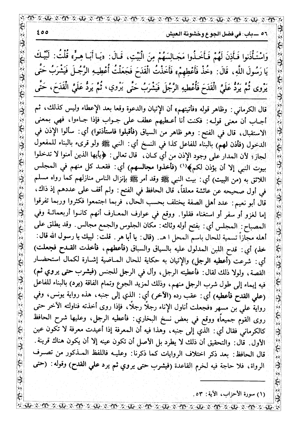 قال الكرماني: وظاهر قوله: «فأتيتهم» أن الإتيان والدعوة وقعا بعد الإعطاء وليس كذلك، ثم أجاب أن معنى قوله: «فكنت أنا أعطيهم» عطف على جواب «فإذا جاءوا» ، فهي بمعنى الاستقبال، قال في «الفتح» : وهو ظاهر من السياق (فأقبلوا فاستأذنوا) أي سألوا الإذن في الدخول (فأذن لهم) بالبناء للفاعل كذا في النسخ: أي النبي، ولو قرىء بالبناء للمفعول لجاز لأن المدار على وجود الإذن من أي كان، قال تعالى: {يا أيها الذين آمنوا لا تدخلوا بيوت النبي إلا أن يؤذن لكم} (الأحزاب: 53) (فأخذوا مجالسهم) أي فقعد كل منهم في المجلس اللائق به (من البيت) أي بيت النبي وقد أمر بإنزال الناس منازلهم كما رواه مسلم في أول «صحيحه» عن عائشة معلقاً، قال الحافظ في «الفتح» : ولم أقف على عددهم إذ ذاك، قال أبو نعيم: عدد أهل الصفة يختلف بحسب الحال، فربما اجتمعوا فكثروا وربما تفرّقوا إما لغزو أو سفر أو استغناء فقلوا. ووقع في عوارف المعارف أنهم كانوا أربعمائة، وفي «المصباح» : المجلس: أي بفتح أوله وثالثه: مكان الجلوس والجمع مجالس. وقد يطلق على أهله مجازاً تسمية للحال باسم المحل اهـ (قال: يا أبا هرّ: قلت لبيك يا رسولالله، قال: خذ) أي قدح اللبن المدلول عليه بالسياق والسباق (فأعطهم، فأخذت القدح فجعلت) أي شرعت (أعطيه الرجل) والإتيان به حكاية للحال الماضية إشارة لكمال استحضار القصة، ولولا ذلك لقال فأعطيته الرجل، وأل في الرجل للجنس