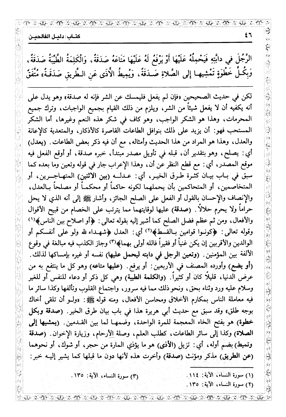 لكن في حديث «الصحيحين» : «فإن لم يفعل فليمسك عن الشر فإنه له صدقة» وهو يدل على أنه يكفيه أن لا يفعل شيئاً من الشرّ ويلزم من ذلك القيام بجميع الواجبات وترك جميع المحرمات، وهذا هو الشكر الواجب، وهو كاف في شكر هذه النعم وغيرها. أما الشكر المستحبّ فهو أن يزيد على ذلك بنوافل الطاعات القاصرة كالأذكار والمتعدية كالإعانة والعدل، وهذا هو المراد من هذا الحديث وأمثاله مع أن فيه ذكر بعض الطاعات (يعدل) أي يصلح وهو بتقدير «أن» قبله في تأويل مصدر مبتدأ خبره صدقة أو أوقع الفعل فيه موقع المصدر: أي مع قطع النظر عن «أن» ، وهذا الإعراب جار في قوله وتعين وما بعده كما سبق في باب بيان كثرة طرق الخير أي عدله (بين الاثنين) المتهاجرين أو المتخاصمين أو المتحاكمين بأن يحملهما لكونه حاكماً أو محكماً أو مصلحاً بالعدل والإنصاف والإحسان بالقول أو الفعل على الصلح الجائز، وأشار إلى أنه الذي لا يحلّ حراماً ولا يحرم حلالاً (صدقة) عليها لوقايتهما مما يترتب على الخصام من قبيح الأقوال والأفعال، ومن ثم عظم فضل الصلح كما أشير إليه بقوله تعالى: