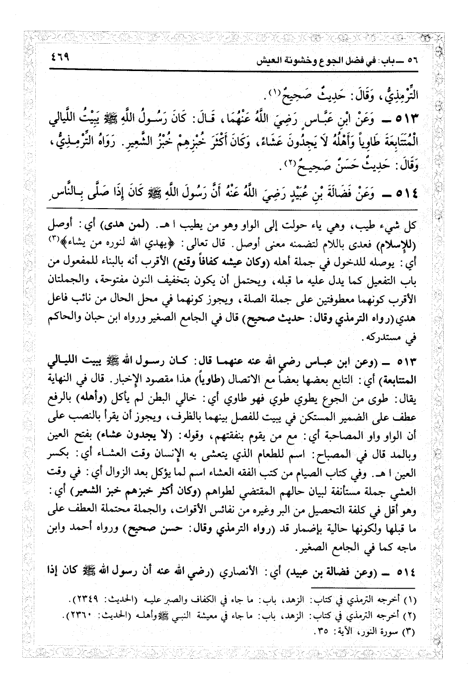 24 - (وعن ابن عباس رضي الله عنهما قال: كان رسول الله - صلى الله عليه وسلم - يبيت الليالي المتتابعة) أي التابع بعضها بعضاً مع الاتصال (طاوياً) هذا مقصود الإخبار. قال في «النهاية» يقال: طوى من الجوع يطوي طوى فهو طاوي: أي خالي لم يأكل (وأهله) بالرفع عطف على الضمير المستكن في يبيت للفصل بينهما بالظرف، ويجوز أن يقرأ بالنصب على أن الواو واو المصاحبة: أي مع من يقوم بنفقتهم، وقوله: (لا يجدون عشاء) بفتح العين وبالمد، قال في «المصباح» : اسم للطعام الذي يتعشى به الإنسان وقت العشاء: أي بكسر العين اهـ. وفي كتاب الصيام من كتب الفقه: العشاء اسم لما يؤكل بعد الزوال: أي في وقت العشي جملة مستأنفة لبيان حالهم المقتضي لطواهم (وكان أكثر خبزهم خبز الشعير) أي وهو أقل في كلفة التحصيل من البرّ وغيره من نفائس الأقوات، والجملة محتملة للعطف على ما قبلها ولكونها حالية بإضمار قد (رواه الترمذي وقال: حسن صحيح) ورواه أحمد وابن ماجه كما في «الجامع الصغير» .