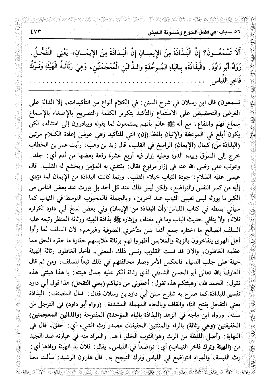 أنواع من التأكيدات: إلا الدالة على العرض والتحضيض على الاستماع والتأكيد بتكرير الكلمة والتصريح بالإصغاء بالاستماع سماع فهم وانتفاع، مع أنه عالم بأنهم يستمعون لما يقوله ويبادرون إلى امتثاله، لكن يكون أبلغ في الموعظة والإتيان بلفظ (إن) للتأكيد وهي عوض إعادة الكلام مرّتين (البذاذة من) كمال (الإيمان) الراسخ في القلب، قال زيد بن وهب: رأيت عمر بن الخطاب خرج إلى السوق وبيده الدرّة وعليه إزار فيه أربع عشرة رقعة بعضها من أدم: أي جلد. وعوتب عليّ رضي الله عنه في إزار مرقوع فقال: يقتدي به المؤمن ويخشع له القلب. قال عيسى عليه السلام: جودة الثياب خيلاء القلب، وإنما كانت البذاذة من الإيمان لما تؤدي إليه من كسر النفس والتواضع، ولكن ليس ذلك عند أكل أحد بل يورث عند بعض الناس من الكبرياء ما يورثه لبس نفيس الثياب عند آخرين، وبالجملة فالمحبوب التوسط في الثياب كما سيأتي بسطه في كتاب اللباس (إن البذاذة من الإيمان) وفي بعض نسخ أبي داود تكراره ثلاثاً، ولا ينافي حديث الباب وما في معناه، وإيثاره بذاذة الهيئة ورثاثة المنظر وتبعه عليه السلف الصالح ما اختاره جمع أئمة من متأخري الصوفية وغيرهم، لأن السلف لما رأوا أهل الهوى يتفاخرون بالزينة والملابس أظهروا لهم برثاثة ملابسهم حقارة ما حقره الحق مما عظم الغافلون، والآن قد قست القلوب ونسي ذلك المعنى، فأخذ الغافلون رثاثة الهيئة حيلة على جلب الدنيا، فانعكس الأمر وصار مخالفتهم في ذلك تبعاً للسلف، ومن ثم قال العارف با تعالى أبو الحسن الشاذلي لذي رثاثة أنكر عليه جمال هيئته: يا هذا هيئتي هذه تقول الحمد، وهيئتكم تقول: أعطوني من دنياكم (يعني التقحل) هذا قول أبي داود وتفسير للبذاذة كما صرح به شارح «سنن أبي داود» بن رسلان فقال: قال المصنف: البذاذة يعني التقحل بفتح التاء والقاف وبالحاء المهملة المشددة. (رواه أبو داود) في الترجل من «سننه» ، ورواه ابن ماجه في الزهد