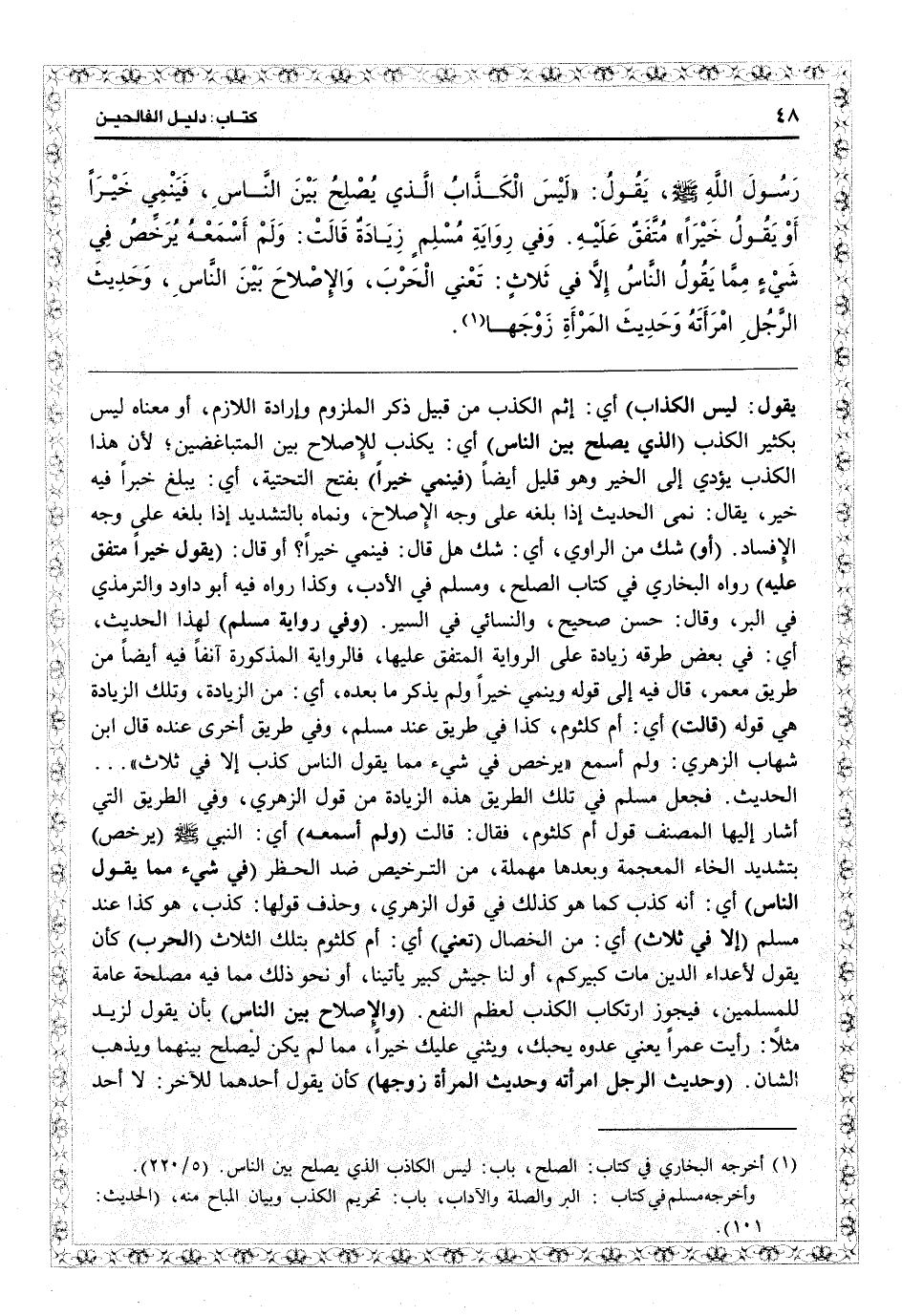 الكذب (الذي يصلح بين الناس) أي يكذب للإصلاح بين المتباغضين لأن هذا الكذب يؤدي إلى الخير وهو قليل أيضاً (فينمي خيراً) بفتح التحتية أي يبلغ خبراً فيه خير يقال نمى الحديث: إذا بلغه على وجه الإصلاح، ونماه بالتشديد: إذا بلغه على وجه الإفساد (أو) شك من الراوي أي شك هل قال: «فينمي خيراً» أو قال (يقول خيراً متفق عليه) رواه البخاري في كتاب الصلح ومسلم في الأدب، وكذا رواه فيه أبو داود والترمذي في البرّ وقال: حسن صحيح، والنسائي في السير.