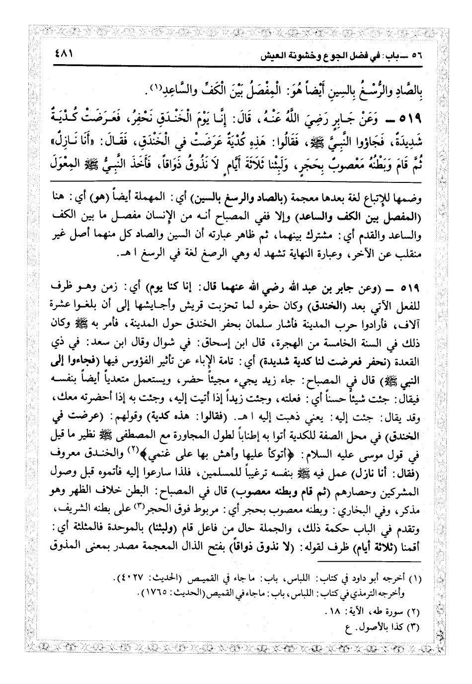 29 - (وعن جابر بن عبد الله رضي الله عنها قال: إنا كنا يوم) أي زمن وهو ظرف للفعل الآتي بعد (الخندق) وكان حفره لما تحزبت قريش واجايشها إلى أن بلغوا عشرة آلاف، فأرادوا حرب المدينة فأشار سلمان بحفر الخندق حول المدينة: فأمر به وكان ذلك في السنة الخامسة من الهجرة، قال ابن إسحاق: في شوّال وقال ابن سعد: في ذي القعدة (نحفر فعرضت لنا كدية شديدة) أي تامة الإباء عن تأثير الفؤوس فيها (فجاءوا إلى النبيّ) قال في «المصباح» جاء زيد يجيء مجيئاً حضر، ويستعمل متعدياً أيضاً بنفسه فيقال: جئت شيئاً حسناً: أي فعلته، وجئت زيداً إذا أتيت إليه، وجئت به إذا أحضرته معك، وقد يقال: جئت إليه: يعني ذهبت إليه اهـ (فقالوا: هذه كدية) وقولهم: (عرضت في الخندق) في محل الصفة للكدية أتوا به إطناباً لطول المحاورة مع المصطفى نظير ما قيل في قوله موسى عليه السلام {أتوكأ عليها وأهشّ بها على غنمي} (طه: 18) والخندق معروف (فقال: أنا نازل) عمل فيه بنفسه ترغيباً للمسلمين، فلذا سارعوا إليه فأتموه قبل وصول المشركين وحصارهم (ثم قام وبطنه معصوب) قال في «المصباح» : البطن خلاف الظهر وهو مذكر، وفي البخاري: وبطنه معصوب بحجر: أي مربوط فوق الحجر عن بطنه الشريف، وتقدم في الباب حكمة ذلك، والجملة حال من فاعل قام (ولبثنا) بالموحدة فالمثلثة: أي قمنا (ثلاثة أيام) ظرف لقوله: (لا نذوق ذواقاً) بفتح الذال المعجمة مصدر بمعنى الذوق: