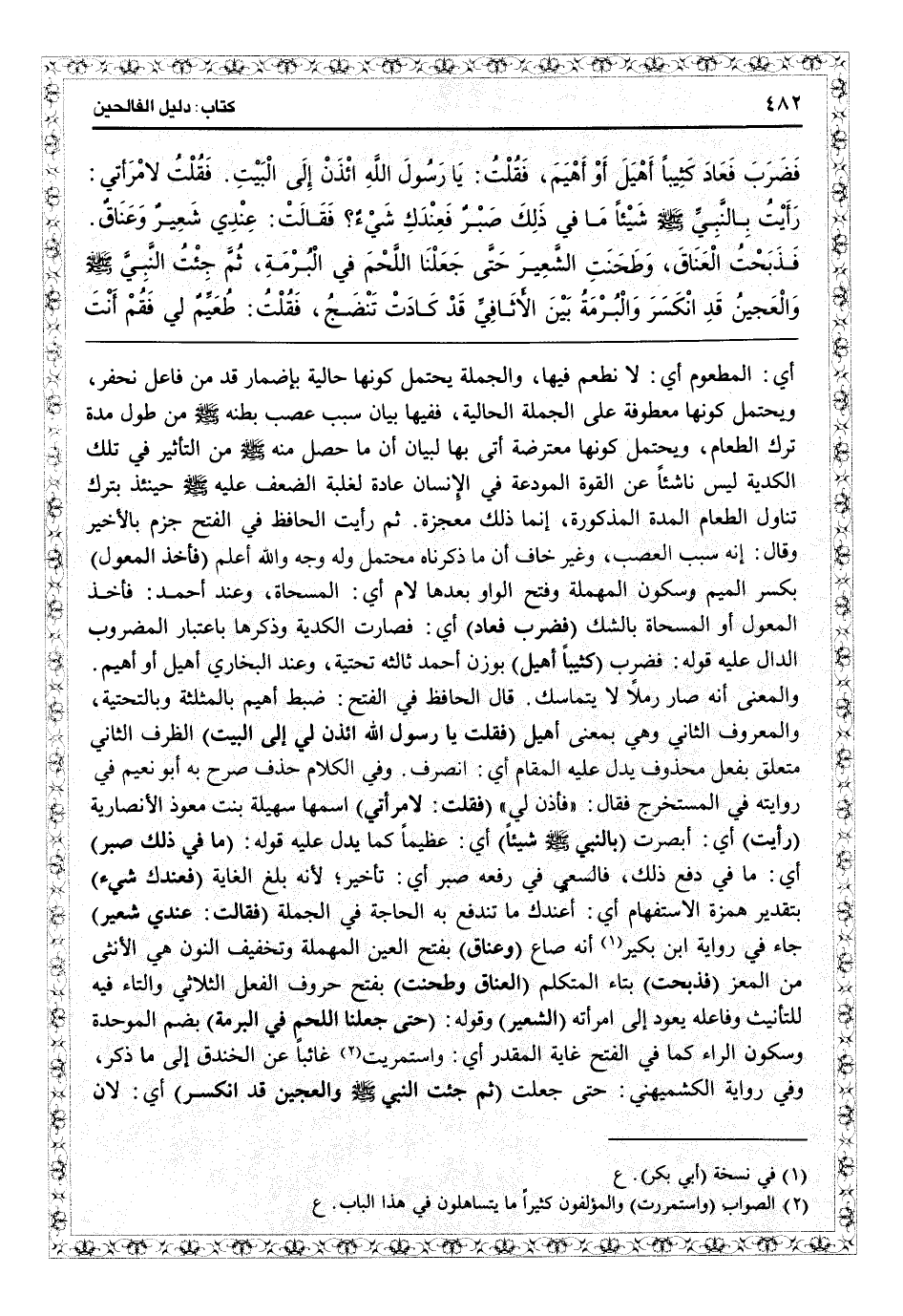 العصب، وغير خاف أن ما ذكرناه محتمل وله أوجه، والله أعلم (فأخذ المعول) بكسر الميم وسكون المهملة وفتح الواو بعدها لام: أي المسحاة، وعند أحمد: فأخذ المعول أو المسحاة بالشك (فضرب فعاد) أي فصارت الكدية وذكرها باعتبار المضروب الدال عليه قوله: فضرب (كثيباً أهيل) بوزن أحمد ثالثه تحتية وعند البخاري أهيل أو أهيم، والمعنى أنه صار رملاً لا يتماسك. قال الحافظ في «الفتح» : ضبط أهيم بالمثلثة وبالتحتية، والمعروف الثاني وهي بمعنى أهيل (فقلت: يا رسول الله ائذن لي إلى البيت) الظرف الثاني متعلق بفعل محذوف يدل عليه المقام: أي انصرف، وفي الكلام حذف صرح به أبو نعيم في روايته في «المستخرج» فقال: «فأذن لي» (فقلت لامرأتي) اسمها سهيلة بنت معوذ الأنصارية (رأيت) أي أبصرت (بالنبي شيئاً) أي عظيماً كما يدل عليه قوله: (ما في ذلك صبر) أي ما في الاستفهام: أي أعندك ما تندفع به الحاجة في الجملة (فقالت: عندي شعير) جاء في رواية ابن بكير أنه صاع (وعناق) بفتح العين المهملة وتخفيف النون هي الأنثى من المعز (فذبحت بتاء المتكلم (العناق وطحنت)) بفتح حروف الفعل الثلاثي والتاء فيه للتأنيث وفاعله يعود إلى امرأته (الشعير) وقوله: (حتى جعلنا اللحم في البرمة) بضم الموحدة وسكون الراء كما في «الفتح» غاية لمقدر: أي واستمريت غائباً عن الخندق إلى ما ذكر، وفي رواية الكشميهني: حتى جعلت (ثم جئت النبي والعجين قد انكسر) أي لان