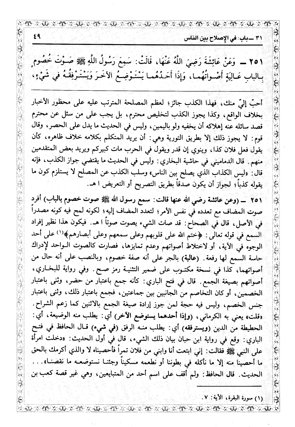 أحبّ إليّ منك، فهذا الكذب جائز لعظم المصلحة المترتب عليه على محظور الإخبار بخلاف الواقع. وكذا يجوز الكذب لتخليص محترم، بل يجب على من سئل عن محترم قصد سائله عن إهلاكه أن يخفيه ولو باليمين، وليس في الحديث ما يدل على الحصر. وقال قوم: لا يجوز ذلك إلا بطريق التورية، وهي أن يريد المتكلم بكلامه خلاف ظاهره كأن يقول فعل فلان كذا وينوي إن قدر، ويقول في الحرب: مات كبيركم ويريد بعض المتقدمين منهم. قال الدماميني في «حاشية البخاري» : وليس في الحديث ما يقتضي جواز الكذب، فإنه قال: «ليس الكذاب الذي يصلح بين الناس» وسلب الكذب عن المصلح لا يستلزم كون ما يقوله كذباً لجواز أن يكون صدقاً بطريق