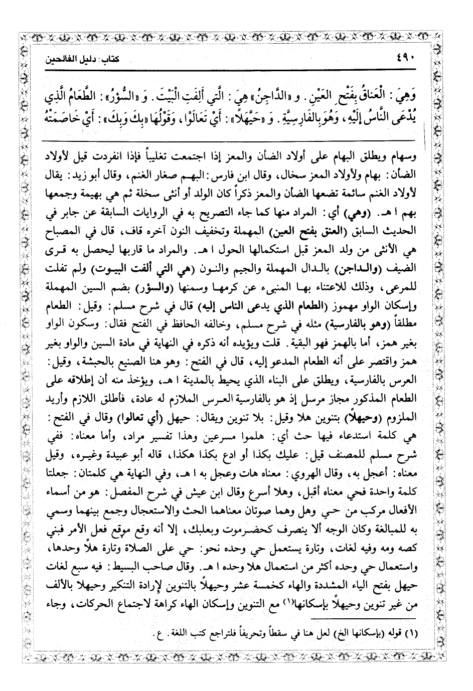 وجمعها بهم اهـ (وهي) أي المراد منها كما جاء التصريح به في الروايات السابقة عن جابر في الحديث السابق (العناق بفتح العين) المهملة وتخفيف النون آخره قاف قال في «المصباح» : هي الأنثى من ولد المعز قبل استكمالها الحول اهـ، والمراد ما قاربها ليحصل به قرى الضيف (والداجن) بالدال المهملة والجيم والنون (هي التي ألفت البيوت) ولم تفلت للمرعى وذلك للاعتناء بها المنبىء عن كرمها وسمنها (والسؤر) بضم السين المهملة وإسكان الواو مهموز (الطعام الذي يدعى الناس إليه) قال في «شرح مسلم» وقيل: الطعام مطلقاً (وهو بالفارسية) مثله في «شرح مسلم» ، وخالفه الحافظ في «الفتح» فقال: وسكون الواو بغير همز، أما بالهمز فهو البقية قلت: ويؤيده أنه ذكره في «النهاية» في مادة السين والواو بغير همز، واقتصر على أنه الطعام المدعو إليه. قال في «الفتح» وهو هنا الصنيع بالحبشة. وقيل: العرس بالفارسية، ويطلق على البناء الذي يحيط بالمدينة اهـ. ويؤخذ منه أن إطلاقه على الطعام المذكور مجار مرسل، إذ هو بالفارسية العرس الملازم له عادة فأطلق اللازم وأريد الملزوم (وحيهلاً) بتنوين هلا. وقيل: بلا تنوين. ويقال: حيهل (أي تعالوا) وقال في «الفتح» : هي كلمة استدعاء فيها حث: أي هلموا مسرعين وهذا تفسير مراد. وأما معناه ففي «شرح مسلم» للمصنف: قيل عليك بكذا أو دع بكذا، هكذا قاله أبو عبيد وغيره، وقيل: معناه أعجل به وقال الهروي: معناه هات وعجل به اهـ. وفي «النهاية» هي كلمتان جعلتا كلمة واحدة فحي معناه أقبل، وهلا أسرع. وقال ابن عيش في «شرح