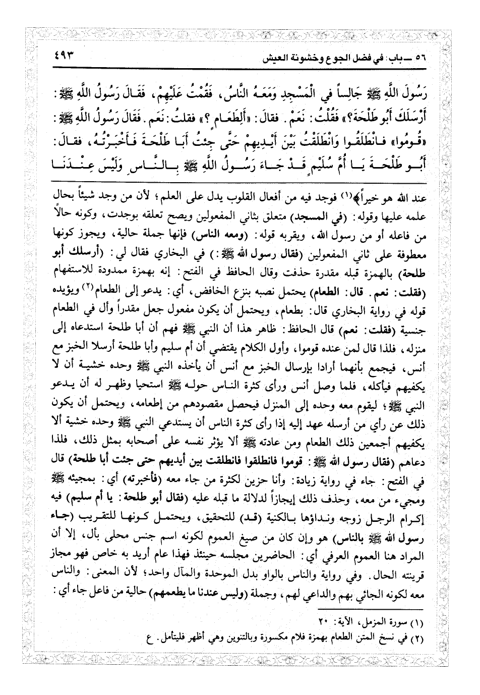 يدل على العلم لأن من وجد شيئاً بحال علمه عليها وقوله: (في المسجد) متعلق بثاني المفعولين ويصح تعلقه بوجدت، وكونه حالاً من فاعله أو من رسولالله، ويقربه قوله: (ومعه الناس) فإنها جملة حالية، ويجوز كونها معطوفة على ثاني المفعولين (فقال رسول الله) في البخاري: «فقال لي» (أرسلك أبو طلحة) بالهمزة مقدرة حذفت. وقال الحافظ في «الفتح» : إنه بهمزة ممدودة للاستفهام (فقلت: نعم. قال: ألطعام) يحتمل نصبه بنزع الخافض أي يدعو إلى الطعام، ويؤيده قوله في رواية البخاري: «قال: بطعام» ، ويحتمل أن يكون مفعول جعل مقدراً وأل في الطعام جنسية (فقلت: نعم) قال الحافظ: ظاهر هذا أن النبيّ فهم أن أبا طلحة استدعاه إلى منزله، فلذا قال لمن عنده قوموا، وأول الكلام يقتضي أن أم سليم وأما طلحة أرسلا الخبز مع أنس، فيجمع بأنهما أرادا بإرسال الخبز مع أنس أن يأخذه النبي وحده خشية أن لا يكفيهم فيأكله فلما وصل أنس ورأى كثرة الناس حوله استحيا وظهر له أن يدعو النبي ليقوم معه وحده إلى المنزل فيحصل مقصودهم من إطعامه، ويحتمل أن يكون ذلك عن رأي من أرسله، عهد إليه إذا رأى كثرة الناس أن يستدعي النبي وحده خشية ألا يكفيهم أجمعين ذلك الطعام ومن عادته ألا يؤثر نفسه على أصحابه بمثل ذلك فلذا دعاهم (فقال رسول الله: قوموا فانطلقوا فانطلقت بين أيديهم حتى جئت أبا طلحة) قال في «الفتح» : جاء في رواية زيادة: «وأنا حزين لكثرة من جاء معه» (فأخبرته) أي بمجيئه ومجيء من معه وحذف ذلك إيجازاً لدلالة ما قبله عليه (فقال أبو طلحة: يا أم سليم) فيه إكرام الرجل زوجه ونداؤها بالكنية (قد) للتحقيق ويحتمل كونها للتقريب (جاء رسول الله - صلى الله عليه وسلم - بالناس) هو وإن كان من صيغ العموم لكونه اسم جنس محلى بأل إلا أن المراد هنا العموم العرفي: أي الحاضرين مجلسه حينئذ فهذا عام أريد به خاص فهو مجاز قرينته الحال. وفي رواية والناس بالواو بدل الموحدة والمآل واحد لأن