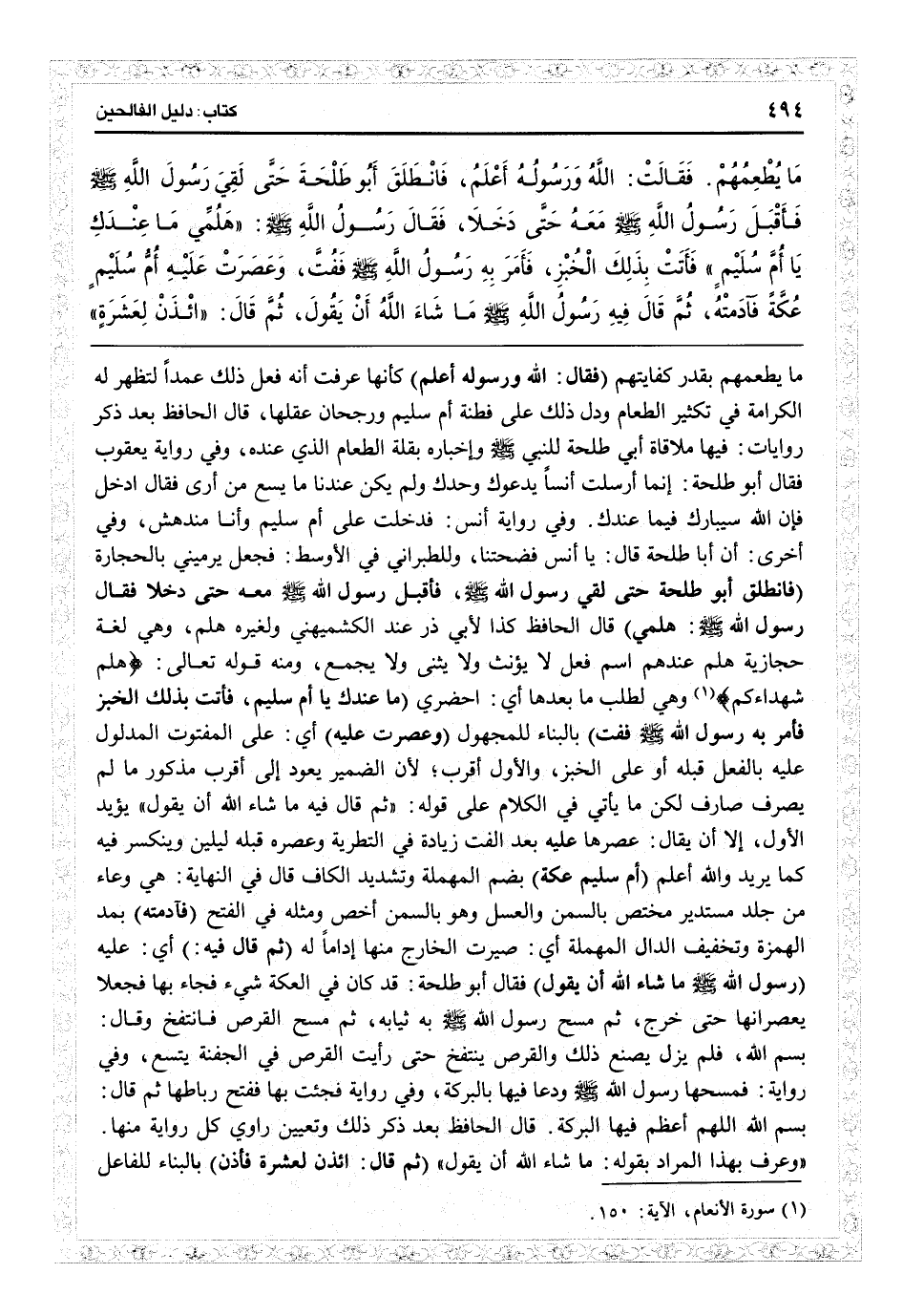 يطعمهم بقدر كفايتهم (فقالت: الله ورسوله أعلم) كأنها عرفت أنه فعل ذلك عمداً لتظهر له الكرامة في تكثير الطعام ودل ذلك على فطنة أم سليم ورجحان عقلها، قال الحافظ بعد ذكر روايات: فيها ملاقاة أبي طلحة للنبيّ وإخباره بقلة الطعام الذي عنده، وفي رواية يعقوب: «قال أبو طلحة إنما أرسلت أنساً يدعوك وحدك ولم يكن عندنا ما يسع من أرى فقال: ادخل فإن الله سيبارك فيما عندك» وفي رواية أنس: «فدخلت على أم سليم وأنا مندهش» ، وفي أخرى: «أن أبا طلحة قال: يا أنس فضحتنا» ، وللطبراني في «الأوسط» : «فجعل يرميني بالحجارة» (فانطلق أبو طلحة حتى لقي رسول الله - صلى الله عليه وسلم - فأقبل رسول الله - صلى الله عليه وسلم - معه حتى دخلا فقال رسول الله - صلى الله عليه وسلم - هلمي) قال الحافظ: كذا لأبي ذرّ عند الكشميهني ولغيره هلم، وهي لغة حجازية هلم عندهم اسم فعل لا يؤنث ولا يثنى ولا يجمع، ومنه قوله تعالى:
