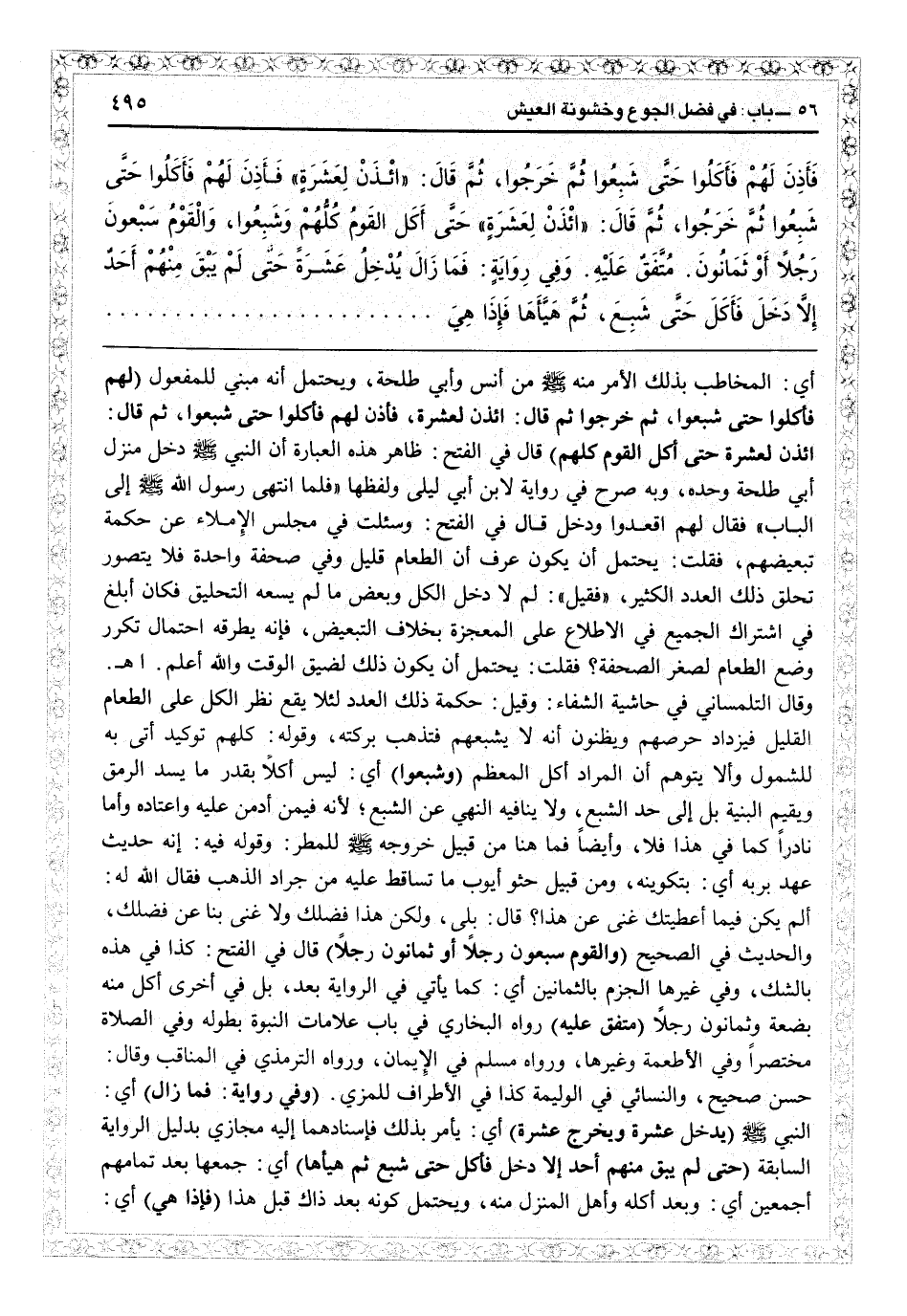 «الفتح» : وسئلت في مجلس الإملاء عن حكمة تبعيضهم، فقلت: يحتمل أن يكون عرف أن الطعام قليل وفي صحفة واحدة فلا يتصوّر تحلق ذلك العدد الكثير، فقيل: لم لا دخل الكل وبعّض ما لم يسعه التحليق فكان أبلغ في اشتراك الجميع في الاطلاع على المعجزة بخلاف التبعيض، فإنه يطرقه احتمال تكرر وضع الطعام لصغر الصحفة؟ فقلت: يحتمل أن يكون ذلك لضيق الوقت والله أعلم اهـ. وقال التلمساني في حاشية «الشفاء» : وقيل: حكمة ذلك العدد لئلا يقع نظر الكل على الطعام القليل فيزداد حرصهم ويظنون أنه لا يشبعهم فتذهب بركته، وقوله: «كلهم» توكيد أتى به للشمول وألا يتوهم أن المراد أكل المعظم (وشبعوا) أي ليس أكلاً بقدر ما يسد الرمق ويقيم البنية بل إلى حد الشبع، ولا ينافيه النهي عن الشبع لأنه فيمن أدمن عليه واعتاده، وأما نادراً كما في هذا فلا، وأيضاً فما هنا من قبيل خروجه للمطر، قوله فيه: إنه حديث عهد بربه: أي بتكوينه، ومن قبيل حثو أيوب عليه السلام ما تساقط عليه من جراد الذهب فقال الله له: ألم يكن فيما أعطيتك غنى عن هذا؟ قال: بلى، ولكن هذا فضلك ولا غنى بنا عن فضلك، والحديث في «الصحيح» (والقوم سبعون رجلاً أو ثمانون) رجلاً قال في «الفتح» : كذا في هذه بالشك، وفي غيرها الجزم بالثمانين: أي كما يأتي في الرواية بعد، بل في أخرى أكل منه بضعة وثمانون رجلاً (متفق عليه) رواه البخاري في باب علامات النبوّة بطوله وفي الصلاة مختصراً وفي الأطعمة وغيرها، رواه مسلم في الإيمان، ورواه الترمذي في المناقب وقال: حسن صحيح، والنسائي في الوليمة كذا في «الأطرف» للمزي.