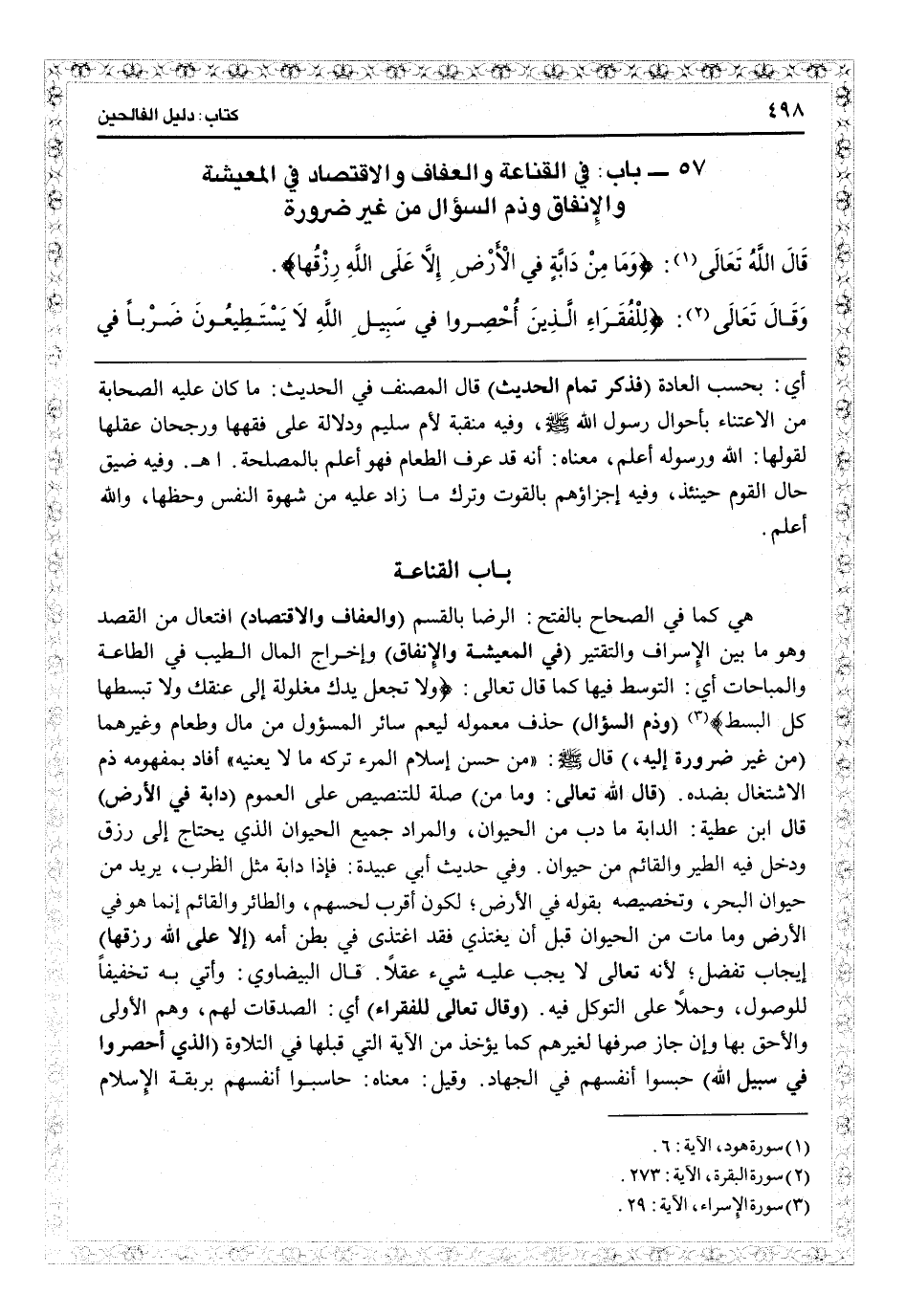 هي كما في «الصحاح» في «الفتح» : الرضا بالقسم (والعفاف والاقتصاد) افتعال من القصد وهو ما بين الإسراف والتقتير (في المعيشة والإنفاق) وإخراج المال الطيب في الطاعة والمباحات: أي التوسط فيها كما قال تعالى: {ولا تجعل يدك مغلولة إلى عنقك ولا تبسطها كل البسط} (الإسراء: 29) (وذمّ السؤال) حذف معموله ليعم سائر المسؤول من مال وطعام وغيرهما (من غير ضرورة) إليه قال: «من حسن إسلام المرء تركه ما لا يعنيه» أفاد بمفهومه ذم الاشتغال بضده.