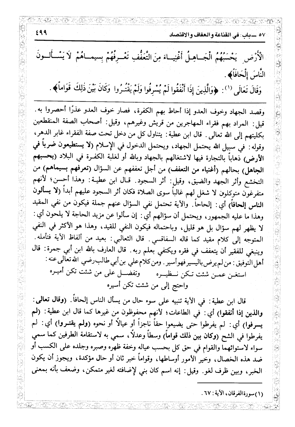(وقال تعالى) : ( {والذين إذا أنفقوا} ) أي من الطاعات لأنهم محفوظون من غيرها كما قال ابن عطية ( {لم يسرفوا} ) أي لم يفرطوا حتى يضيعوا حقاً ناجزاً أو عيالاً أو نحوه ( {ولم يقتروا} ) أي لم يفرطوا في الشحّ ( {وكان بين ذلك قواماً} ) وسطاً وعدلاً، سمي به لاستقامة الطرفين كما سمي سواء لاستوائهما، والقوام في حق كل بحسب عياله وخفة ظهره وصبره وجلده على الكسب أو ضد هذه الخصال، وخير الأمور أوساطها، وقواماً خبر ثان أو حال مؤكدة، ويجوز أن يكون الخبر و «بين» : ظرف لغو، وقيل: إنه اسم كان، بني لإضافته لغير متمكن، وضعف بأنه بمعنى