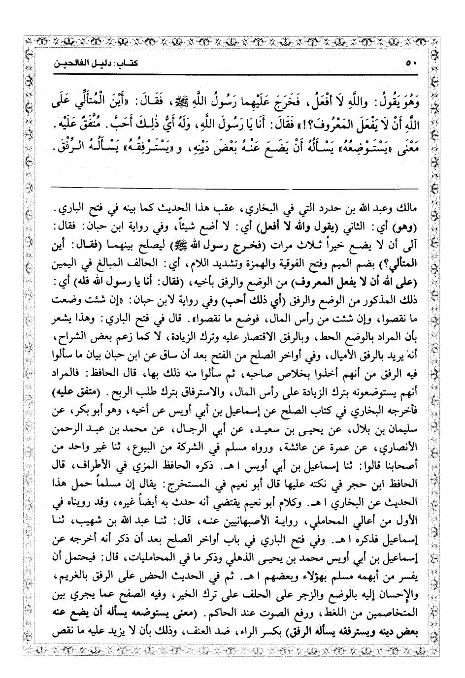 اليمين (على الله أن لا يفعل المعروف) من الوضع والرفق بأخيه (فقال: أنا يا رسول الله فله) أي ذلك المذكور من الوضع والرفق (أي ذلك أحبّ) وفي رواية لابن حبان: «إن شئت وضعت ما نقصوا، وإن شئت من رأس المال فوضع ما نقصوا» قال في «فتح الباري» : وهذا يشعر بأن المراد بالوضع الحط، وبالرفع الاقتصار عليه وترك الزيادة، لا كما زعم بعض الشراح أنه يريد بالرفق الإمهال. وفي أواخر الصلح من الفتح بعد أن ساق عن ابن حبان بيان ما سألوا فيه الرفق من أنهم أخذوا بخلاص صاحبه ثم سألوا منه ذلك بها قال الحافظ: فالمراد أنهم يستوضعونه بترك الزيادة على رأس المال والاسترقاق بترك طلب الربح (متفق عليه) فأخرجه البخاري في كتاب الصلح عن إسماعيل بن أبي أويس عن أخيه وهو أبو بكر عن سليمان بن بلال عن يحيى بن سعيد عن أبي الرجال عن محمد بن عبد الرحمن الأنصاري عن عمرة عن عائشة، ورواه مسلم في الشركة من البيوع: ثنا غيرواحد من أصحابنا قالوا: ثنا إسماعيل بن أبي أويس اهـ. ذكره الحافظ المزيّ في «الأطراف» . قال الحافظ ابن حجر في «نكته» عليها: قال أبو نعيم في «المستخرج» : يقال إن مسلماً حمل هذا الحديث عن البخاري اهـ. وكلام أبي نعيم يقتضي أنه حدث به أيضاً غيره، وقد رويناه في الأول من أعالي المحاملي رواية الإصبهانيين عنه قال ثنا إسماعيل فذكره اهـ. وفي «فتح الباري» في باب أواخر الصلح بعد أن ذكر أنه أخرجه عن إسماعيل بن أبي أويس: محمد بن يحيى الذهلي وذكر ما في المحامليات قال: فيحتمل أن يفسر من أبهمه مسلم بهؤلاء وبعضهم اهـ. ثم في الحديث الحض على الرفق بالغريم والإحسان إليه بالوضع والزجر على الحلف على ترك الخير، وفيه الصفح عما يجري بين المتخاصمين من اللفظ ورفع الصوت عند الحاكم (معنى يستوضعه: يسأله أن يضع عنه بعض دينه، ويسترفقه: يسأله الرفق) بكسر الراء ضد العنف وذلك بأن لا يزيد عليه ما نقص