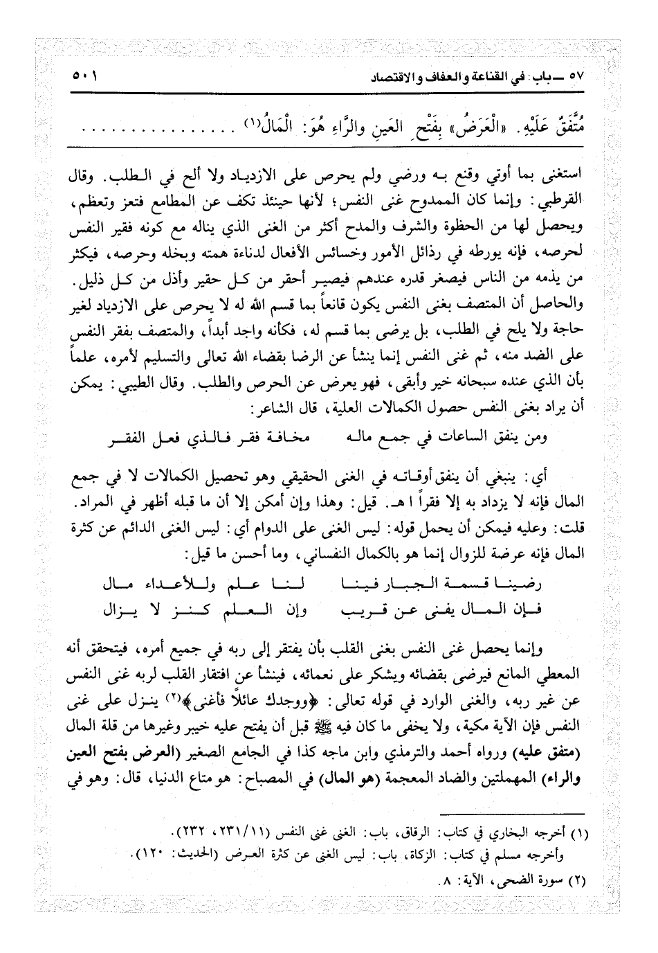 وإنما يحصل غنى النفس بغنى القلب بأن يفتقر إلى ربه في جميع أمره، فيتحقق أنه المعطي المانع فيرضى بقضائه ويشكر على نعمائه، فينشأ عن افتقار القلب لربه غنى النفس عن غير ربه، والغنى الوارد في قوله تعالى: {ووجدك عائلاً فأغنى} (الضحى: 8) ينزل على غنى النفس، فإن الآية مكية، ولا يخفى ما كان فيه قبل أن يفتح عليه خيبر وغيرها من قلة المال (متفق عليه) ورواه أحمد والترمذي وابن ماجه، كذا في «الجامع الصغير» (العرض بفتح العين والراء) المهملتين والضاد المعجمة (هو المال) في «المصباح» : هو متاع الدنيا قال: وهو في