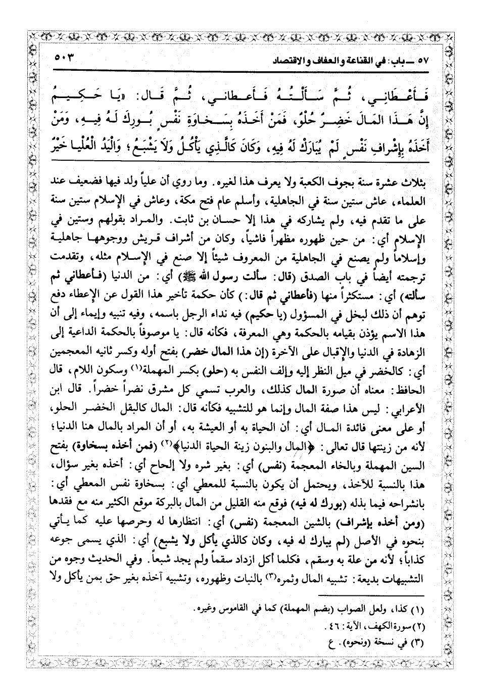 بثلاث عشرة سنة بجوف الكعبة ولا يعرف هذا لغيره، وما روي أن علياً ولد فيها فضعيف عند العلماء، عاش ستين سنة في الجاهلية، وأسلم عام فتح مكة، وعاش في الإسلام ستين سنة على ما تقدم فيه، ولم يشاركه في هذا إلا حسان بن ثابت. والمراد بقولهم وستين في الإسلام: أي من حين ظهوره مظهراً فاشياً، وكان من أشراف قريس ووجوهها جاهلية وإسلاماً ولم يصنع في الجاهلية من المعروف شيئاً إلا صنع في الإسلام مثله، وتقدمت ترجمته أيضاً في باب الصدق (قال: سألت رسول الله) أي من الدنيا (فأعطاني ثم سألته) أي مستكثراً منها (فأعطاني ثم قال) كأن حكمة تأخير هذا القول عن الإعطاء دفع توهم أن ذلك لبخل في المسؤول (يا حكيم) فيه نداء الرجل باسمه، وفيه تنبيه وإيماء إلى هذا الاسم يؤذن بقيامه بالحكمة وهي المعرفة فكأنه قال: يا موصوفاً بالحكمة الداعية إلى الزهادة في الدنيا والإقبال على الآخرة (إن هذا المال خضر) بفتح أوله وكسر ثانيه المعجمين: أي كالخضر في ميل النظر إليه وإلف النفس به (حلو) بكسر المهملة وسكون اللام، قال الحافظ: معناه أن صورة المال وإنما هو للتشبيه فكأنه قال: المال كالبقل الخضر الحلو أو على معنى فائدة المال: أي إن الحياة به أو العيشة به، أو أن المراد بالمال هنا الدنيا لأنه من زينتها قال تعالى: {المال والبنون زينة الحياة الدنيا} (الكهف: 46) (فمن أخذه بسخاوة) بفتح السين المهملة وبالخاء المعجمة (نفس) أي بغير شره ولا إلحاح: أي أخذه بغير سؤال هذا بالنسبة للأخذ، ويحتمل أن يكون بالنسبة للمعطي: أي بسخاوة نفس المعطي: أي بانشراحه فيما بذله (بورك له فيه) فوقع منه القليل من المال والبركة موضع الكثير منه مع فقدها (ومن أخذه بإشراف) بالشين المعجمة (نفس) أي انتظارها له