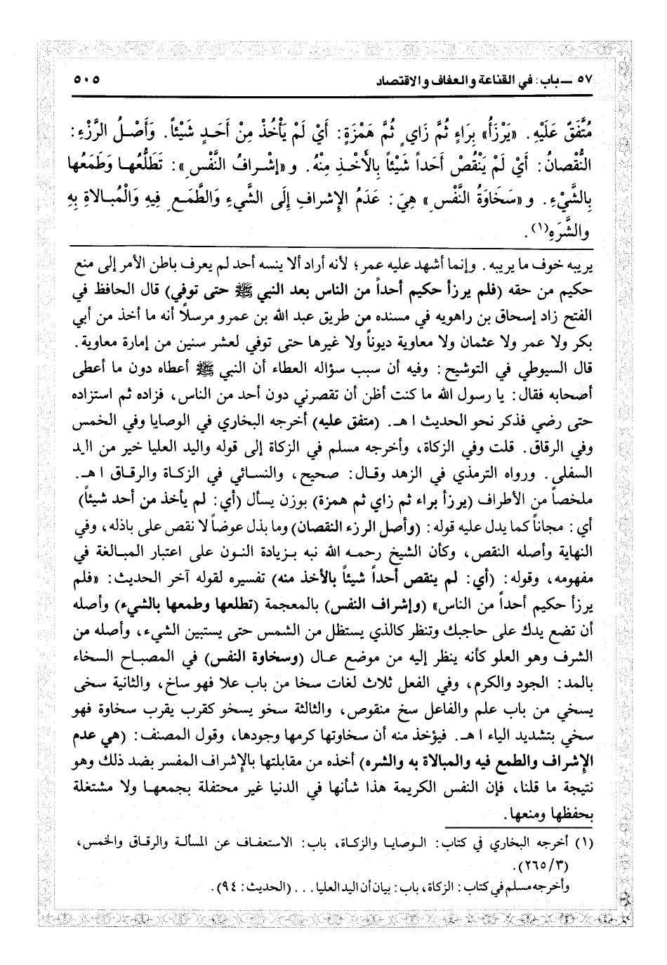 مفهومه وقوله: (أي لم ينقص أحداً شيئاً بالأخذ منه) تفسير لقوله آخر الحديث: فلم يرزأ حكيم أحداً من الناس (وإشراف النفس) بالمعجمة (تطلعها وطمعها بالشيء) وأصله أن تضع يدك على حاجبك وتنظر كالذي يستظلّ من الشمس حتى يستبين الشيء، وأصله من الشرف وهو العلوّ كأنه ينظر إليه من موضع عال (وسخاوة النفس) وفي «المصباح» السخاء بالمد: الجود والكرم، وفي الفعل ثلاث لغات سخا من باب علا فهو ساخ، وفي الثانية سخى يسخي من باب علم والفاعل سخ منقوص، والثاثة سخو يسخو كقرب يقرب سخاوة فهو سخي بتشديد الياء اهـ. فيؤخذ منه أن سخاوتها كرمها وجودها وقول المصنف (هي عدم الإشراف والطمع فيه والمبالاة به والشره) أخذه من مقابلتها بالإشراف المفسر بضد ذلك وهو نتيجة ما قلنا، فإن النفس الكريمة هذا شأنها في الدنيا غير مختلفة بجمعها ولا مشتغلة بحفظها ومنعها.