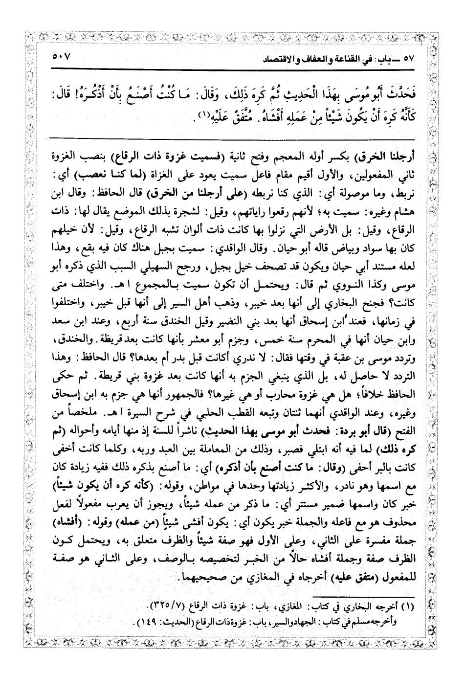 أرجلنا الخرق) بكسر أوله المعجم وفتح ثانيه (فسميت غزوة ذات الرقاع) بنصب الغزوة ثاني المفعولين، والأول أقيم مقام فاعل سميت يعود على الغزاة (لما كنا نعصب) أي نربط، وما موصولة: أي الذي كنا نربطه (على أرجلنا من الخرق) قال الحافظ وقال ابن هشام وغيره: سميت به لأنهم رقعوا راياتهم، وقيل: لشجرة بذلك الموضع يقال لها: ذات الرقاع، وقيل: بل الأرض التي نزلوا بها كانت ذات ألوان تشبه الرقاع، وقيل: لأن خيلهم كان بها سواد وبياض قال أبو حيان. وقال الواقدي: سميت بجبل هناك كان فيه بقع، وهذا لعله مستند أبي حيان ويكون قد تصحف خيل بجبل، ورجح السهيلي السبب الذي ذكره أبو موسى وكذا النووي ثم قال: ويحتمل أن تكون سميت بالمجموع اهـ واختلف متى كانت؟ فجنح البخاري إلى أنها بعد خيبر، وذهب أهل السير إلى أنها قبل خيبر، واختلفوا في زمانها فعند ابن إسحاق أنها بعد بني النضير وقبل الخندق سنة أربع، وعند ابن سعد وابن حيان أنها في المحرم سنة خمس وجزم أبو معشر بأنها كانت بعد قريظة والخندق وتردد موسى بن عقبة في وقتها فقال: لا ندري أكانت قبل بدر أو بعدها؟ قال الحافظ: وهذا التردد لا حاصل له، بل الذي ينبغي الجزم به أنها كانت بعد غزوة بني قريظة. ثم حكى الحافظ خلافاً: هل هي غزوة محارب أو هي غيرها؟ فالجمهور أنها هي، جزم به ابن إسحاق وغيره، وعند الواقدي أنهما ثنتان، وتبعه القطب الحلبي في «شرح السيرة» اهـ ملخصاً من «الفتح» (قال أبو بردة: فحدث أبو موسى بهذا الحديث) ناشراً للسنة إذ منها أيامه وأحواله (ثم كره