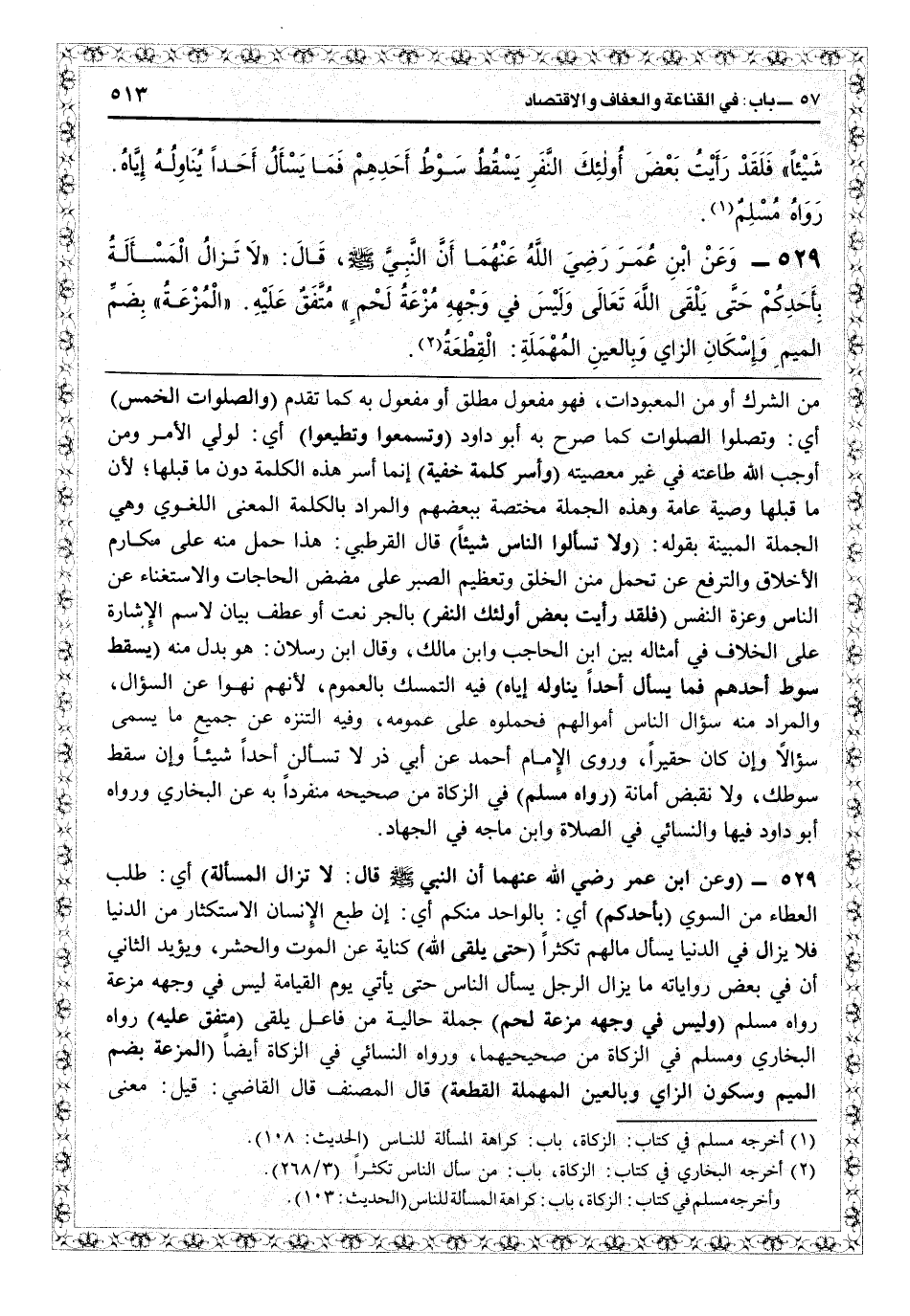 9 - (وعن ابن عمر رضي الله عنهما أن النبيّ قال: لا تزال المسألة) أي طلب العطاء من السوي (بأحدكم) أي بالواحد منكم أي إن طبع الإنسان الاستكثار من الدنيا فلا يزال في الدنيا يسأل مالهم تكثراً (حتى يلقى ا) كناية عن الموت والحشر، ويؤيد الثاني أن بعض رواياته: «ما يزال الرجل يسأل الناس حتى يأتي يوم القيامة ليس في وجهه مزعة» رواه مسلم (وليس في وجهه مزعة لحم) جملة حالية من فاعل يلقى (متفق عليه) رواه البخاري ومسلم في الزكاة من «صحيحهما» ، رواه النسائي في الزكاة أيضاً (المزعة بضم الميم وسكون الزاي وبالعين المهملة القطعة) قال المصنف قال القاضي: قيل معنى